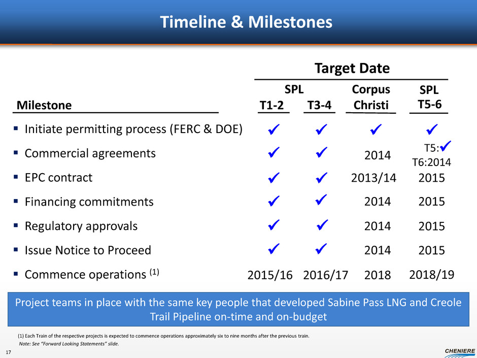 Timeline & Milestones Initiate permitting process (FERC & DOE) Commercial agreements EPC contract Financing commitments Regulatory approvals Issue Notice to Proceed Commence operations (1) Milestone Corpus Christi (1) Each Train of the respective projects is expected to commence operations approximately six to nine months after the previous train. Note: See “Forward Looking Statements” slide. T3-4 T1-2 Target Date 2015/16 Project teams in place with the same key people that developed Sabine Pass LNG and Creole Trail Pipeline on-time and on-budget SPL 17 2016/17 2014 2018/19 2014 2014 2013/14 2014 T5-6 2015 2015 2015 2015 2018 SPL T5: T6:2014