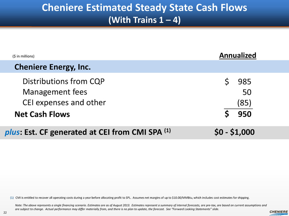 CQP Estimated Distributable Cash Flows Trains 1-4 Total distributable cash flow by units (1) General partner Cheniere common units Public and BX common units Net cash flow per unit (1) 295 690 690 $ 3.00 $ Total distributable cash flow $ 1,675 ($ in millions) SPLNG distributable cash flow SPL distributable cash flow CTPL distributable cash flow CQP expenses $ 365 1,285 40 (15) plus: Est. CF generated at CQP from CMI SPA (2) $0 - $250 (1) Assumes the conversion of all subordinated units and Class B units to common units and assumes ~228 million of public and Blackstone common units, ~232 million Cheniere common units and 2% general partner interest and IDRs held by Cheniere. (2) Assumes net margins of $10.00/MMBtu. Note: The above represents a single financing scenario. Estimates are as of August 2013. Estimates represent a summary of internal forecasts, are pre-tax, are based on current assumptions and are subject to change. Actual performance may differ materially from, and there is no plan to update, the forecast. See “Forward Looking Statements” slide. 21