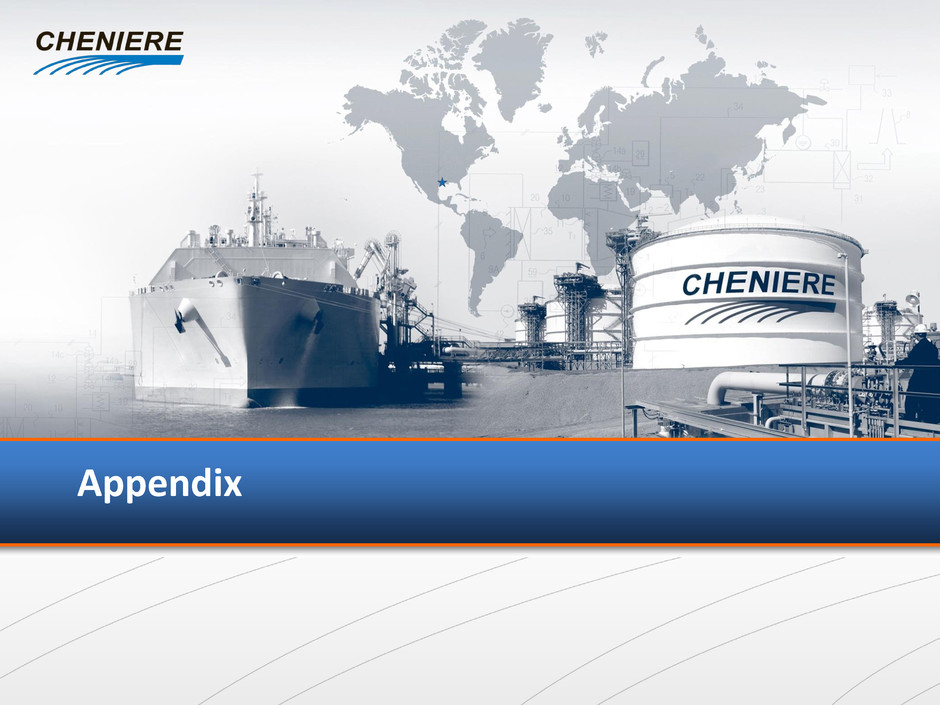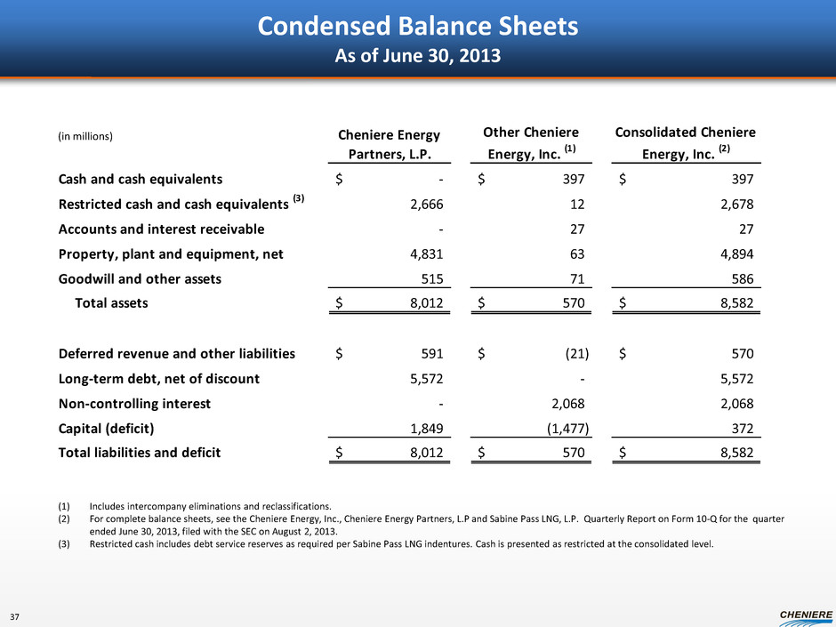 Condensed Balance Sheets As of June 30, 2013 (1) Includes intercompany eliminations and reclassifications. (2) For complete balance sheets, see the Cheniere Energy, Inc., Cheniere Energy Partners, L.P and Sabine Pass LNG, L.P. Quarterly Report on Form 10-Q for the quarter ended June 30, 2013, filed with the SEC on August 2, 2013. (3) Restricted cash includes debt service reserves as required per Sabine Pass LNG indentures. Cash is presented as restricted at the consolidated level. 37 (in millions) Cheniere Energy Partners, L.P. Other Cheniere Energy, Inc. (1) Consolidated Cheniere Energy, Inc. (2) Cash and cash equivalents -$ 397$ 397$ Restricted cash and cash equivalents (3) 2,666 12 2,678 Accounts and interest receivable - 27 27 Property, plant and equipment, net 4,831 63 4,894 Goodwill and other assets 515 71 586 Total assets 8,012$ 570$ 8,582$ Deferred revenue and other liabilities 591$ (21)$ 570$ Long-term debt, net of discount 5,572 - 5,572 Non-controlling interest - 2,068 2,068 Capital (deficit) 1,849 (1,477) 372 Total liabilities and deficit 8,012$ 570$ 8,582$