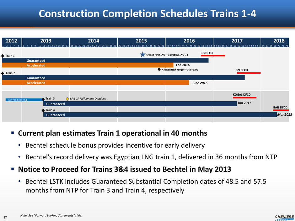 Contracted Capacity at SPLNG Third Party Terminal Use Agreements (TUAs) Long-term, 20 year “take-or-pay” style commercial contracts ~$253MM annual fixed fee revenue Total Gas & Power N.A. Chevron U.S.A. Inc. Capacity 1.0 Bcf/d 1.0 Bcf/d Fees (1) Reservation Fee (2) $0.28/MMBTU $0.28/MMBTU Opex Fee (3) $0.04/MMBTU $0.04/MMBTU Full-Year Payments $124 million $129 million Term 20 years 20 years Guarantor Total S.A. Chevron Corp. Guarantor Credit Rating ** Aa1/AA Aa1/AA Payment Start Date April 1, 2009 July 1, 2009 (1) Fees do not vary with the actual quantity of LNG processed; tax reimbursement not included in the fees. (2) No inflation adjustments. (3) Subject to annual inflation adjustment. Note: Termination Conditions – (a) force majeure of 18 months or (b) unable to satisfy customer delivery requirements of ~192MMbtu in a 12-month period, 15 cargoes over 90 days or 50 cargoes in a 12-month period. In the case of force majeure, the customers are required to pay their capacity reservation fees for the initial 18 months. **Ratings may be changed, suspended or withdrawn at anytime and are not a recommendation to buy, hold or sell any security. 26