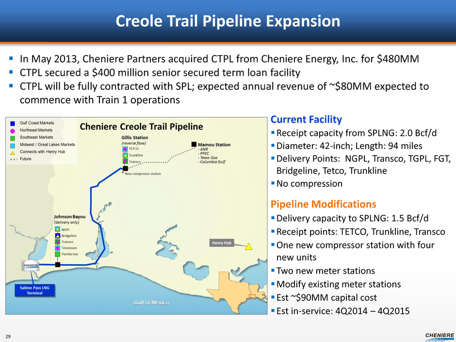 Current Facility Receipt capacity from SPLNG: 2.0 Bcf/d Diameter: 42-inch; Length: 94 miles Delivery Points: NGPL, Transco, TGPL, FGT, Bridgeline, Tetco, Trunkline No compression Pipeline Modifications Delivery capacity to SPLNG: 1.5 Bcf/d Receipt points: TETCO, Trunkline, Transco One new compressor station with four new units Two new meter stations Modify existing meter stations Est ~$90MM capital cost Est in-service: 4Q2014 – 4Q2015 Creole Trail Pipeline Expansion In May 2013, Cheniere Partners acquired CTPL from Cheniere Energy, Inc. for $480MM CTPL secured a $400 million senior secured term loan facility CTPL will be fully contracted with SPL; expected annual revenue of ~$80MM expected to commence with Train 1 operations 29