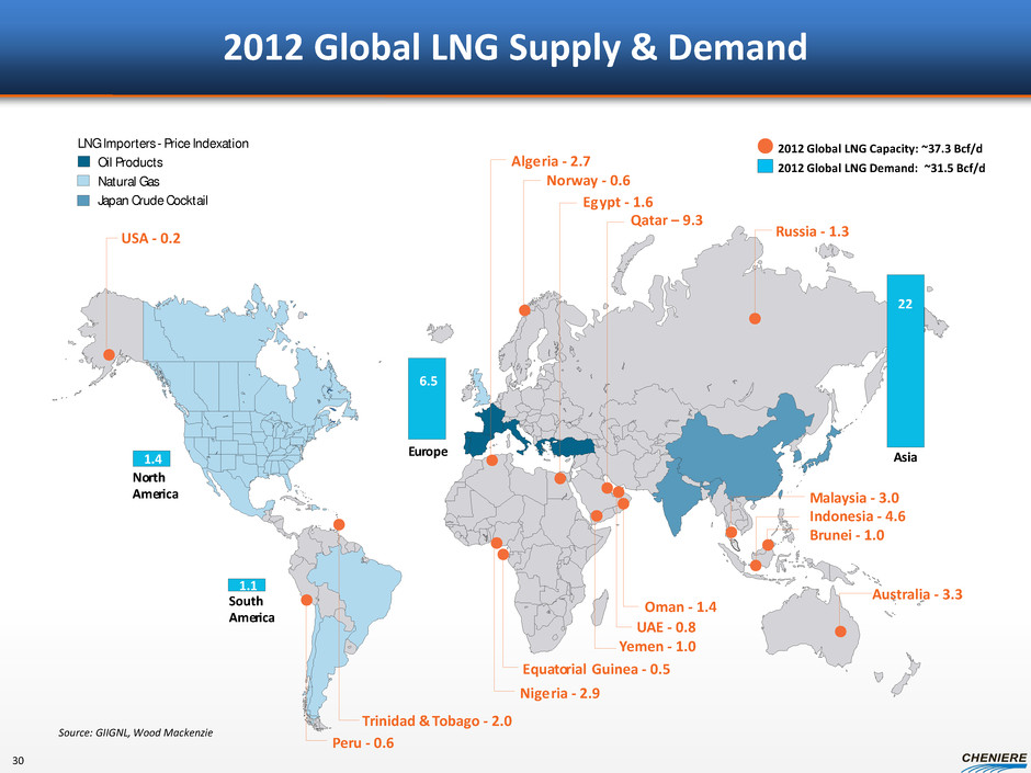 2012 Global LNG Supply & Demand 2012 Global LNG Capacity: ~37.3 Bcf/d Natural Gas Oil Products LNG Importers - Price Indexation Japan Crude Cocktail 2012 Global LNG Demand: ~31.5 Bcf/d No r th Ame r ica S outh Ame r ica E u r ope A sia 6.5 1.4 1.1 22 A ust r alia - 3.3 B r unei - 1.0 Indonesia - 4.6 M al a y sia - 3.0 A lge r ia - 2.7 N o r w a y - 0.6 Q a tar – 9.3 R ussia - 1.3 E g ypt - 1.6 Y emen - 1.0 Nige r ia - 2.9 T r inidad & T obago - 2.0 E qua t o r ial G uinea - 0.5 Oman - 1.4 U AE - 0.8 USA - 0.2 P e r u - 0.6 Source: GIIGNL, Wood Mackenzie 30