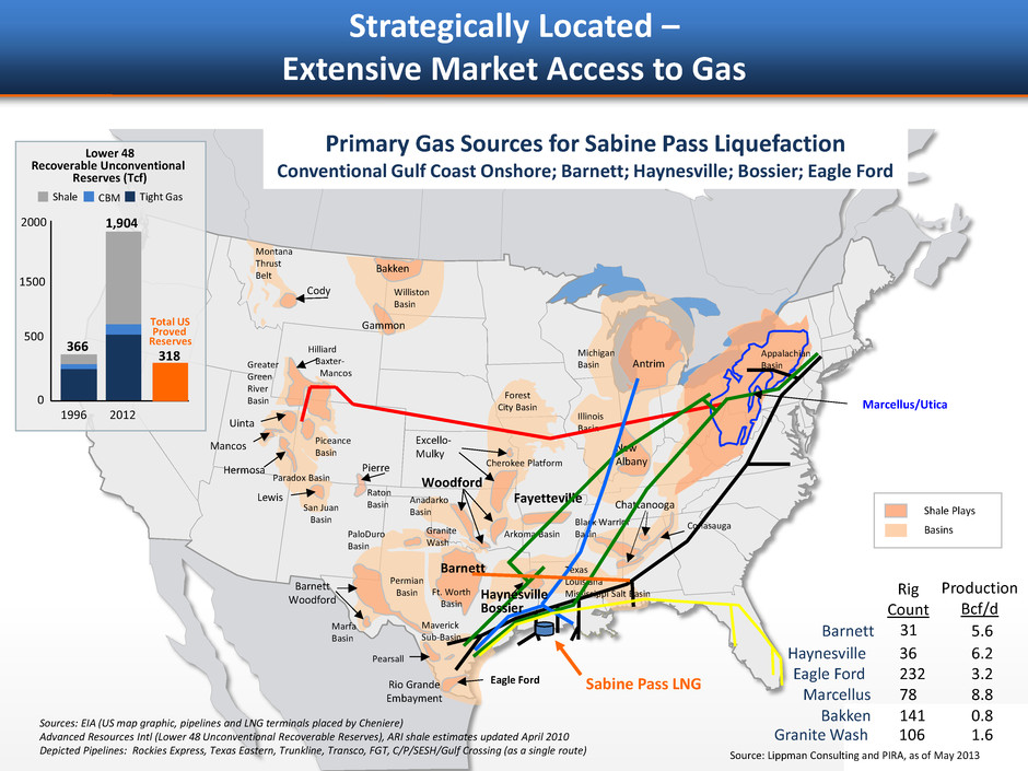 Montana Thrust Belt Cody Gammon Hilliard Baxter- Mancos Greater Green River Basin Forest City Basin Pierre Illinois Basin Piceance Basin Lewis San Juan Basin Raton Basin Anadarko Basin PaloDuro Basin Permian Basin Barnett Woodford Pearsall Eagle Ford Rio Grande Embayment Barnett Woodford Michigan Basin Antrim New Albany Chattanooga Texas Louisiana Mississippi Salt Basin Fayetteville Ft. Worth Basin Arkoma Basin Conasauga Black Warrior Basin Marfa Basin Paradox Basin Maverick Sub-Basin Hermosa Mancos Cherokee Platform Excello- Mulky Appalachian Basin Marcellus/Utica Shale Plays Basins Sabine Pass LNG Haynesville Bossier Granite Wash Williston Basin Bakken Primary Gas Sources for Sabine Pass Liquefaction Conventional Gulf Coast Onshore; Barnett; Haynesville; Bossier; Eagle Ford Sources: EIA (US map graphic, pipelines and LNG terminals placed by Cheniere) Advanced Resources Intl (Lower 48 Unconventional Recoverable Reserves), ARI shale estimates updated April 2010 Depicted Pipelines: Rockies Express, Texas Eastern, Trunkline, Transco, FGT, C/P/SESH/Gulf Crossing (as a single route) Rig Count Production Bcf/d Barnett 31 5.6 Haynesville 36 6.2 Eagle Ford 232 3.2 Granite Wash 106 1.6 Bakken 141 0.8 Marcellus 78 8.8 Source: Lippman Consulting and PIRA, as of May 2013 Uinta Strategically Located – Extensive Market Access to Gas 366 1,904 Lower 48 Recoverable Unconventional Reserves (Tcf) 0 500 1500 1996 2012 Shale CBM Tight Gas Total US Proved Reserves 2000 318