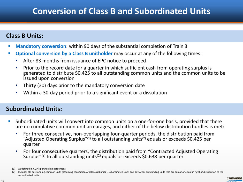 Conversion of Class B and Subordinated Units Mandatory conversion: within 90 days of the substantial completion of Train 3 Optional conversion by a Class B unitholder may occur at any of the following times: • After 83 months from issuance of EPC notice to proceed • Prior to the record date for a quarter in which sufficient cash from operating surplus is generated to distribute $0.425 to all outstanding common units and the common units to be issued upon conversion • Thirty (30) days prior to the mandatory conversion date • Within a 30-day period prior to a significant event or a dissolution Subordinated units will convert into common units on a one-for-one basis, provided that there are no cumulative common unit arrearages, and either of the below distribution hurdles is met: • For three consecutive, non-overlapping four-quarter periods, the distribution paid from “Adjusted Operating Surplus”(1) to all outstanding units(2) equals or exceeds $0.425 per quarter • For four consecutive quarters, the distribution paid from “Contracted Adjusted Operating Surplus”(1) to all outstanding units(2) equals or exceeds $0.638 per quarter 35 Class B Units: Subordinated Units: (1) As defined in CQP’s partnership agreement. (2) Includes all outstanding common units (assuming conversion of all Class B units ), subordinated units and any other outstanding units that are senior or equal in right of distribution to the subordinated units.