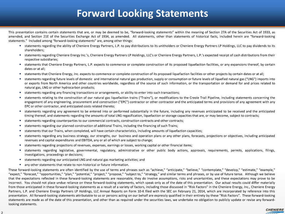 Forward Looking Statements 2 This presentation contains certain statements that are, or may be deemed to be, “forward-looking statements” within the meaning of Section 27A of the Securities Act of 1933, as amended, and Section 21E of the Securities Exchange Act of 1934, as amended. All statements, other than statements of historical facts, included herein are “forward-looking statements.” Included among “forward-looking statements” are, among other things: statements regarding the ability of Cheniere Energy Partners, L.P. to pay distributions to its unitholders or Cheniere Energy Partners LP Holdings, LLC to pay dividends to its shareholders; statements regarding Cheniere Energy Inc.’s, Cheniere Energy Partners LP Holdings, LLC’s or Cheniere Energy Partners, L.P.’s expected receipt of cash distributions from their respective subsidiaries; statements that Cheniere Energy Partners, L.P. expects to commence or complete construction of its proposed liquefaction facilities, or any expansions thereof, by certain dates or at all; statements that Cheniere Energy, Inc. expects to commence or complete construction of its proposed liquefaction facilities or other projects by certain dates or at all; statements regarding future levels of domestic and international natural gas production, supply or consumption or future levels of liquefied natural gas (“LNG”) imports into or exports from North America and other countries worldwide, regardless of the source of such information, or the transportation or demand for and prices related to natural gas, LNG or other hydrocarbon products; statements regarding any financing transactions or arrangements, or ability to enter into such transactions; statements relating to the construction of our natural gas liquefaction trains (“Trains”), or modifications to the Creole Trail Pipeline, including statements concerning the engagement of any engineering, procurement and construction ("EPC") contractor or other contractor and the anticipated terms and provisions of any agreement with any EPC or other contractor, and anticipated costs related thereto; statements regarding any agreement to be entered into or performed substantially in the future, including any revenues anticipated to be received and the anticipated timing thereof, and statements regarding the amounts of total LNG regasification, liquefaction or storage capacities that are, or may become, subject to contracts; statements regarding counterparties to our commercial contracts, construction contracts and other contracts; statements regarding our planned construction of additional Trains, including the financing of such Trains; statements that our Trains, when completed, will have certain characteristics, including amounts of liquefaction capacities; statements regarding any business strategy, our strengths, our business and operation plans or any other plans, forecasts, projections or objectives, including anticipated revenues and capital expenditures and EBITDA, any or all of which are subject to change; statements regarding projections of revenues, expenses, earnings or losses, working capital or other financial items; statements regarding legislative, governmental, regulatory, administrative or other public body actions, approvals, requirements, permits, applications, filings, investigations, proceedings or decisions; statements regarding our anticipated LNG and natural gas marketing activities; and any other statements that relate to non-historical or future information. These forward-looking statements are often identified by the use of terms and phrases such as “achieve,” “anticipate,” “believe,” “contemplate,” “develop,” “estimate,” “example,” “expect,” “forecast,” “opportunities,” “plan,” “potential,” “project,” “propose,” “subject to,” “strategy,” and similar terms and phrases, or by use of future tense. Although we believe that the expectations reflected in these forward-looking statements are reasonable, they do involve assumptions, risks and uncertainties, and these expectations may prove to be incorrect. You should not place undue reliance on these forward-looking statements, which speak only as of the date of this presentation. Our actual results could differ materially from those anticipated in these forward-looking statements as a result of a variety of factors, including those discussed in “Risk Factors” in the Cheniere Energy, Inc., Cheniere Energy Partners, L.P. and Cheniere Energy Partners LP Holdings, LLC Annual Reports on Form 10-K filed with the SEC on February 21, 2014, which are incorporated by reference into this presentation. All forward-looking statements attributable to us or persons acting on our behalf are expressly qualified in their entirety by these ”Risk Factors”. These forward-looking statements are made as of the date of this presentation, and other than as required under the securities laws, we undertake no obligation to publicly update or revise any forward- looking statements.