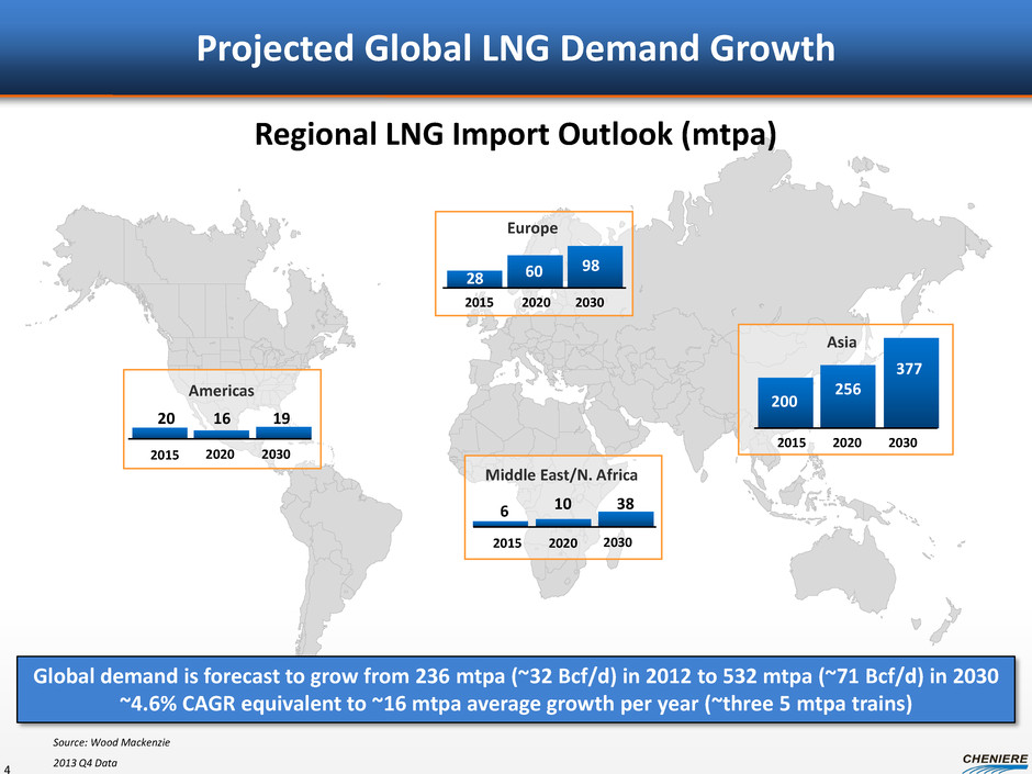 Summary Organizational Structure 3 Cheniere Energy, Inc. (NYSE: LNG) Sabine Pass LNG, L.P. (“SPLNG”) Sabine Pass Liquefaction, LLC (“SPL”) Cheniere Energy Partners, L.P. (NYSE: CQP) Cheniere Creole Trail Pipeline, L.P. (“CTPL”) Corpus Christi Liquefaction, LLC (“CCL”) Cheniere Marketing, LLC (“CMI”) Cheniere Energy Partners GP, LLC 100% Interest 100% Interest 100% Interest 100% Interest (1) Current ownership interest. As Class B units accrete Blackstone will increase its ownership percentage, and the public and CQH will have reduced ownership percentages. See Slide 37. Liquefaction facilities 13.5 mtpa under development Regasification facilities 4.0 Bcf/d of capacity 17.0 Bcf of storage 2 berths Liquefaction facilities 18 mtpa under construction 9 mtpa under development Cheniere Energy Partners LP Holdings, LLC (NYSE: CQH) 1.5 Bcf/d capacity for SPL Provides gas supply for SPL 84.5% Interest 55.9% Interest (1) 2.0% Interest & Incentive Dist. Rights Int’l LNG marketing 2 mtpa contract with SPL Three 5-year LNG vessel charters Blackstone (BX) 29.0% (1) Public 13.1% (1) Public 15.5% Next Developments