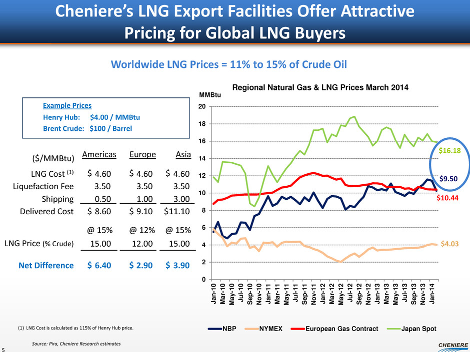 Projected Global LNG Demand Growth 4 Regional LNG Import Outlook (mtpa) Source: Wood Mackenzie 2013 Q4 Data 20 16 19 2015 2020 2030 2015 2020 2030 6 10 38 2015 2020 2030 2015 2020 2030 Americas Asia Middle East/N. Africa 200 256 377 28 60 98 Global demand is forecast to grow from 236 mtpa (~32 Bcf/d) in 2012 to 532 mtpa (~71 Bcf/d) in 2030 ~4.6% CAGR equivalent to ~16 mtpa average growth per year (~three 5 mtpa trains) Europe