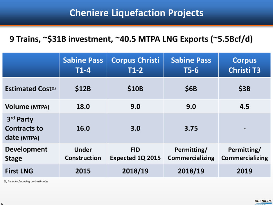 Cheniere’s LNG Export Facilities Offer Attractive Pricing for Global LNG Buyers 5 Example Prices Henry Hub: $4.00 / MMBtu Brent Crude: $100 / Barrel ($/MMBtu) Americas Europe Asia LNG Cost (1) 4.60 $ 4.60 4.60 Shipping 0.50 1.00 3.00 $ 8.60 9.10 11.10 3.90 LNG Price (% Crude) @ 15% 15.00 12.00 15.00 Net Difference 6.40 $ 2.90 Liquefaction Fee 3.50 3.50 3.50 Delivered Cost Source: Pira, Cheniere Research estimates @ 12% @ 15% $ $ $ $ $ $ (1) LNG Cost is calculated as 115% of Henry Hub price. Worldwide LNG Prices = 11% to 15% of Crude Oil $4.03 $9.50 $16.18 $10.44 0 2 4 6 8 10 12 14 16 18 20 J a n -1 0 M a r- 1 0 M a y-1 0 Jul -1 0 S ep -1 0 N o v- 1 0 J a n -1 1 M a r- 1 1 M a y-1 1 Jul -1 1 S ep -1 1 N o v- 1 1 J a n -1 2 M a r- 1 2 M a y-1 2 Jul -1 2 S ep -1 2 N o v- 1 2 J a n -1 3 M a r- 1 3 M a y-1 3 Jul -1 3 S ep -1 3 N o v- 1 3 J a n -1 4 MMBtu Regional Natural Gas & LNG Prices March 2014 NBP NYMEX European Gas Contract Japan Spot