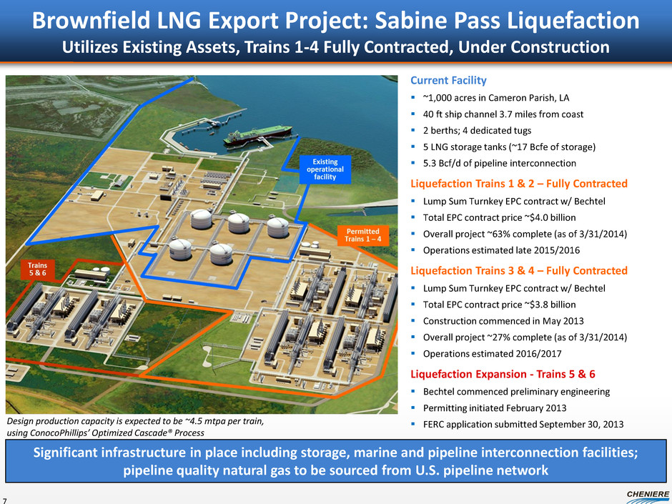 Cheniere Liquefaction Projects 6 Sabine Pass T1-4 Corpus Christi T1-2 Sabine Pass T5-6 Corpus Christi T3 Estimated Cost(1) $12B $10B $6B $3B Volume (MTPA) 18.0 9.0 9.0 4.5 3rd Party Contracts to date (MTPA) 16.0 3.0 3.75 - Development Stage Under Construction FID Expected 1Q 2015 Permitting/ Commercializing Permitting/ Commercializing First LNG 2015 2018/19 2018/19 2019 9 Trains, ~$31B investment, ~40.5 MTPA LNG Exports (~5.5Bcf/d) (1) Includes financing cost estimates
