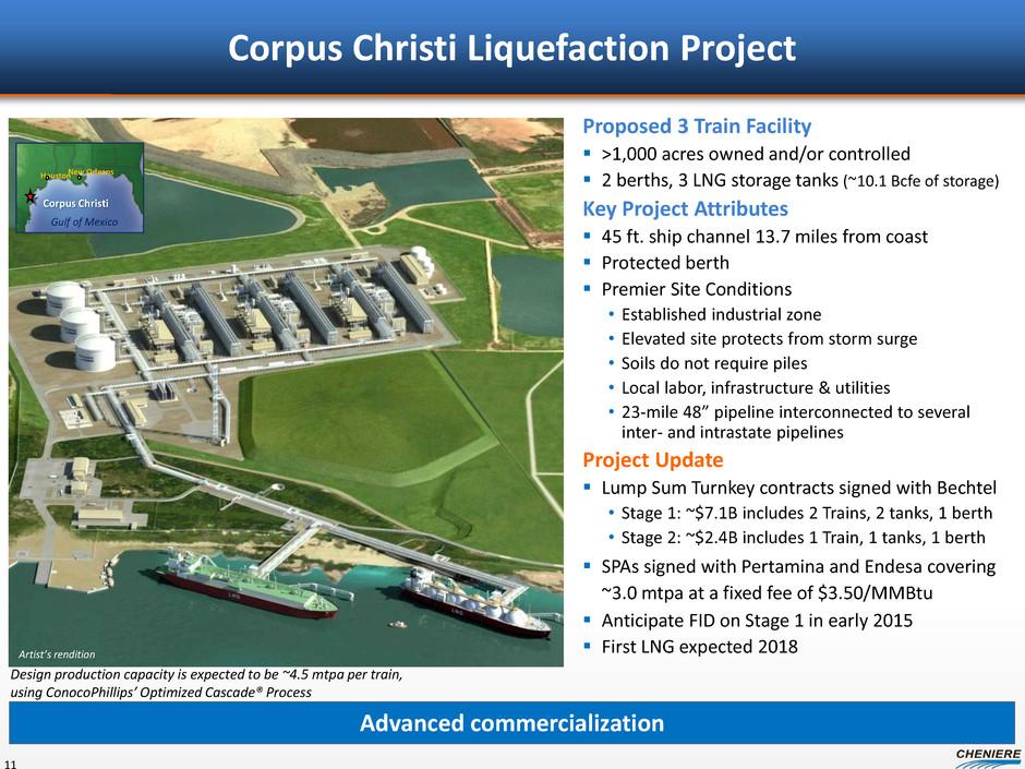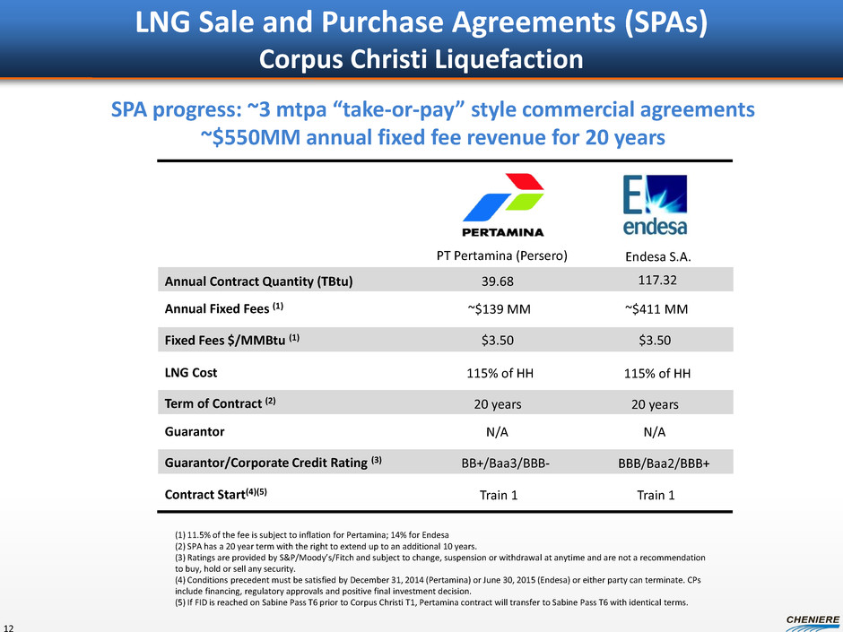 LNG Sale and Purchase Agreements (SPAs) Sabine Pass Liquefaction 8 (1) BG has agreed to purchase 182,500,000 MMBtu, 36,500,000 MMBtu, 34,000,000 MMBtu and 33,500,000 MMBtu of LNG volumes annually upon the commencement of operations of Trains 1, 2, 3 and 4, respectively. Total has agreed to purchase 91,250,000 MMBtu of LNG volumes annually plus 13,400,000 MMBtu of seasonal LNG volumes upon the commencement of Train 5 operations. (2) A portion of the fee is subject to inflation, approximately 15% for BG Group, 13.6% for Gas Natural Fenosa, 15% for KOGAS and GAIL (India) Ltd and 11.5% for Total and Centrica. (3) Following commercial in service date of Train 4. BG will provide annual fixed fees of approximately $520 million during Trains 1-2 operations and an additional $203 million once Trains 3-4 are operational. (4) SPAs have a 20 year term with the right to extend up to an additional 10 years. Gas Natural Fenosa has an extension right up to an additional 12 years in certain circumstances. (5) Ratings are provided by S&P/Moody’s/Fitch and subject to change, suspension or withdrawal at anytime and are not a recommendation to buy, hold or sell any security. (6) Conditions precedent must be satisfied by June 30, 2015 or either party can terminate. CPs include financing, regulatory approvals and positive final investment decision. BG Gulf Coast LNG Gas Natural Fenosa Annual Contract Quantity (MMBtu) 286,500,000 (1) Fixed Fees $/MMBtu (2) Annual Fixed Fees (2) ~$723 MM (3) ~$454 MM Term of Contract (4) Guarantor 20 years BG Energy Holdings Ltd. Gas Natural SDG S.A. Corporate / Guarantor Credit Rating (5) A-/A2/A- BBB/Baa2/BBB+ Fee During Force Majeure Up to 24 months Up to 24 months 20 years GAIL (India) Limited ~$548 MM 20 years NR/Baa2/BBB- N/A N/A Contract Start Train 1 + additional volumes with Trains 2,3,4 Train 2 Train 4 $2.25 - $3.00 $2.49 $3.00 182,500,000 182,500,000 20 years N/A N/A A+/A1/AA- Train 3 $3.00 ~$548 MM Korea Gas Corporation 182,500,000 ~$314 MM 20 years AA-/Aa1/AA N/A Total S.A. Train 5 $3.00 104,750,000 (1) Total Gas & Power N.A. (6) ~$274 MM 20 years A-/A3/A- N/A N/A $3.00 91,250,000 Centrica plc (6) Train 5 LNG Cost 115% of HH 115% of HH 115% of HH 115% of HH 115% of HH 115% of HH ~20 mtpa “take-or-pay” style commercial agreements ~$2.9B annual fixed fee revenue for 20 years