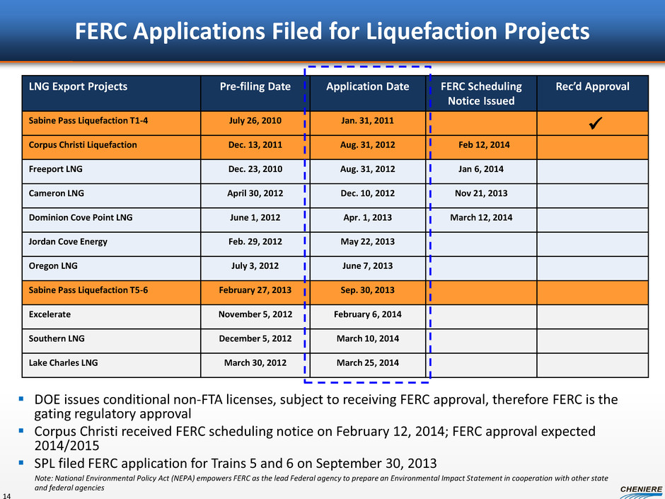 Regulatory Approvals – Corpus Christi and SPL Trains 5-6 Corpus Christi Trains 1-3 • FERC: Scheduling Notice received 2/2014, final EIS expected October 8, 2014, 90-day federal authorization decision deadline January 6, 2015 • DOE: Received FTA authorization in 10/2012 • DOE: Non-FTA authorization is pending; Corpus Christi is #2 on the DOE “Order of Precedence” SPL Trains 5-6 • FERC: Application filed Sept. 30, 2013, expecting Scheduling Notice in 2014 • DOE: Received FTA authorization for Total and Centrica SPAs in 7/2013, received FTA authorization for Train 6 in 1/2014 • DOE: Non-FTA authorization is pending; Total volume is #13, Centrica volume is #14, Train 6 and remaining Train 5 volumes are #18 on the “Order of Precedence” 13 DOE export approvals and FERC construction and operation approvals needed for Corpus Christi Liquefaction Trains 1-3 and Sabine Pass Liquefaction Trains 5&6