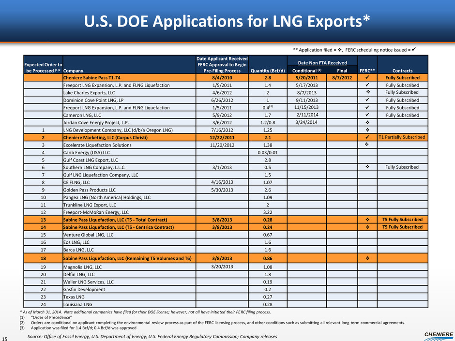 FERC Applications Filed for Liquefaction Projects DOE issues conditional non-FTA licenses, subject to receiving FERC approval, therefore FERC is the gating regulatory approval Corpus Christi received FERC scheduling notice on February 12, 2014; FERC approval expected 2014/2015 SPL filed FERC application for Trains 5 and 6 on September 30, 2013 14 LNG Export Projects Pre-filing Date Application Date FERC Scheduling Notice Issued Rec’d Approval Sabine Pass Liquefaction T1-4 July 26, 2010 Jan. 31, 2011 Corpus Christi Liquefaction Dec. 13, 2011 Aug. 31, 2012 Feb 12, 2014 Freeport LNG Dec. 23, 2010 Aug. 31, 2012 Jan 6, 2014 Cameron LNG April 30, 2012 Dec. 10, 2012 Nov 21, 2013 Dominion Cove Point LNG June 1, 2012 Apr. 1, 2013 March 12, 2014 Jordan Cove Energy Feb. 29, 2012 May 22, 2013 Oregon LNG July 3, 2012 June 7, 2013 Sabine Pass Liquefaction T5-6 February 27, 2013 Sep. 30, 2013 Excelerate November 5, 2012 February 6, 2014 Southern LNG December 5, 2012 March 10, 2014 Lake Charles LNG March 30, 2012 March 25, 2014 Note: National Environmental Policy Act (NEPA) empowers FERC as the lead Federal agency to prepare an Environmental Impact Statement in cooperation with other state and federal agencies