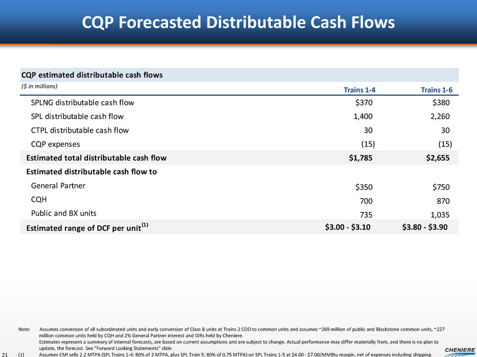 Potential Financial Profile of CEI 20 (1) As of January 2014, 238.1 million shares outstanding, plus 30 million CEI shares under proposed 2014 - 2018 management compensation plan. Cheniere development of ~41 MTPA of US liquefaction capacity (9 trains) leads to EBITDA of $3.3 - $4.5 billion (unconsolidated) CEI level debt of ~$4 billion (unconsolidated) CEI share count of 268 million(1)