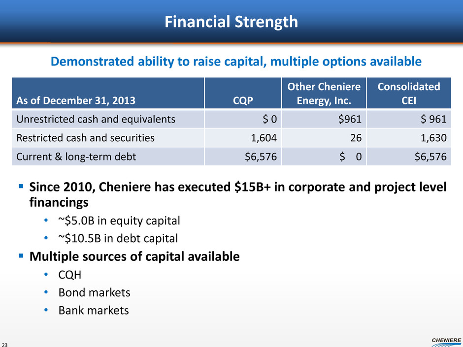$0.3 $1.2 $2.6 $2.9 $3.2 $4.4 – $0.5 $1.0 $1.5 $2.0 $2.5 $3.0 $3.5 $4.0 $4.5 2015E 2016E 2017E 2018E 2019E 2020E ($ in bil lio ns ) SPLNG SPL T1-4 SPL T5 SPL T6 SPL commodity pmts CMI share – 347 823 939 1,046 1,378 (100) 100 300 500 700 900 1,100 1,300 1,500 2015E 2016E 2017E 2018E 2019E 2020E (TB tu pe r y ea r) SPL T1-4 SPL T5 SPL T6 CMI CQP Outlook – Visible Future Growth 22 Note: Estimates represent a summary of internal forecasts, are based on current assumptions and are subject to change. Actual performance may differ materially from, and there is no plan to update, the forecast. See “Forward Looking Statements” slide. Estimated LNG export volumes Estimated CQP revenues Estimated CQP distributable cash flow per unit $1.70 $3.00 - $3.10 $3.80 - $3.90 – $0.50 $1.00 $1.50 $2.00 $2.50 $3.00 $3.50 $4.00 $4.50 Current SPL Trains 1-4 SPL Trains 1-6 Di str ibu ta ble cas h f low pe r u nit ($ pe r u nit )