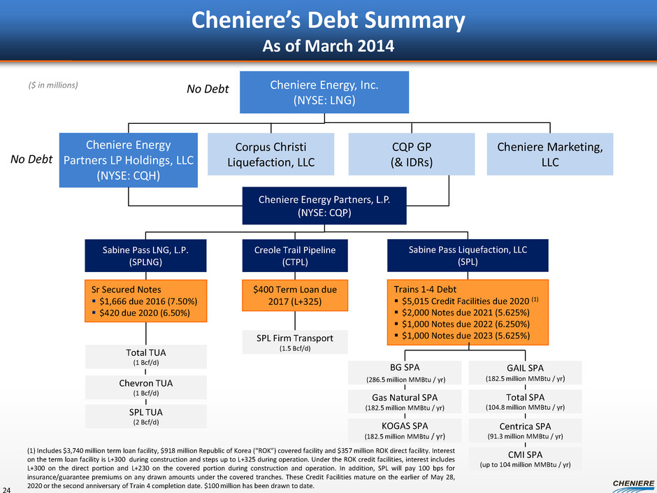 Financial Strength 23 Since 2010, Cheniere has executed $15B+ in corporate and project level financings • ~$5.0B in equity capital • ~$10.5B in debt capital Multiple sources of capital available • CQH • Bond markets • Bank markets Demonstrated ability to raise capital, multiple options available As of December 31, 2013 CQP Other Cheniere Energy, Inc. Consolidated CEI Unrestricted cash and equivalents $ 0 $961 $ 961 Restricted cash and securities 1,604 26 1,630 Current & long-term debt $6,576 $ 0 $6,576