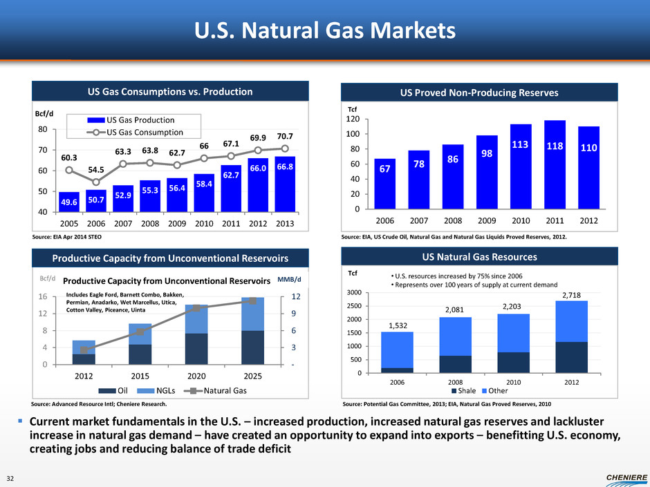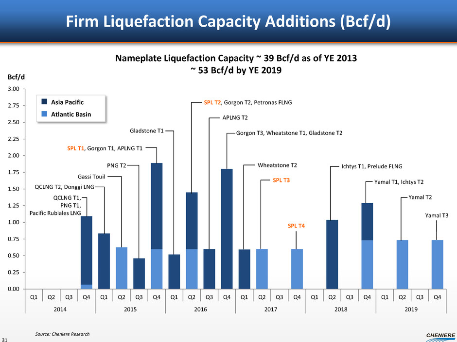 Firm Liquefaction Capacity Additions (Bcf/d) 31 0.00 0.25 0.50 0.75 1.00 1.25 1.50 1.75 2.00 2.25 2.50 2.75 3.00 Q1 Q2 Q3 Q4 Q1 Q2 Q3 Q4 Q1 Q2 Q3 Q4 Q1 Q2 Q3 Q4 Q1 Q2 Q3 Q4 Q1 Q2 Q3 Q4 2014 2015 2016 2017 2018 2019 Asia Pacific Atlantic Basin Bcf/d Nameplate Liquefaction Capacity ~ 39 Bcf/d as of YE 2013 ~ 53 Bcf/d by YE 2019 Source: Cheniere Research QCLNG T1, PNG T1, Pacific Rubiales LNG SPL T1, Gorgon T1, APLNG T1 Gassi Touil PNG T2 Gorgon T3, Wheatstone T1, Gladstone T2 Gladstone T1 Wheatstone T2 APLNG T2 SPL T3 Yamal T1, Ichtys T2 Ichtys T1, Prelude FLNG Yamal T2 QCLNG T2, Donggi LNG SPL T2, Gorgon T2, Petronas FLNG SPL T4 Yamal T3