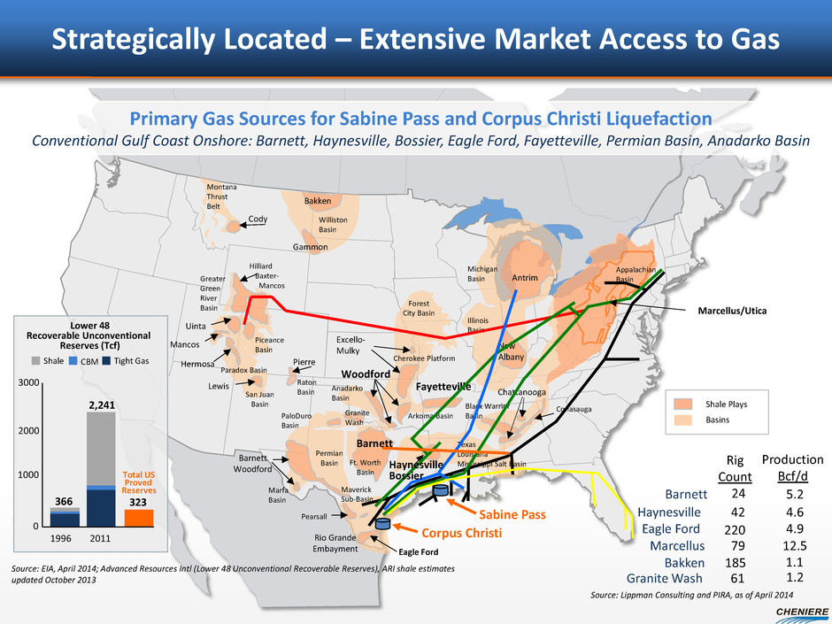 Montana Thrust Belt Cody Gammon Hilliard Baxter- Mancos Greater Green River Basin Forest City Basin Pierre Illinois Basin Piceance Basin Lewis San Juan Basin Raton Basin Anadarko Basin PaloDuro Basin Permian Basin Barnett Woodford Pearsall Eagle Ford Rio Grande Embayment Barnett Woodford Michigan Basin Antrim New Albany Chattanooga Texas Louisiana Mississippi Salt Basin Fayetteville Ft. Worth Basin Arkoma Basin Conasauga Black Warrior Basin Marfa Basin Paradox Basin Maverick Sub-Basin Hermosa Mancos Cherokee Platform Excello- Mulky Appalachian Basin Marcellus/Utica Shale Plays Basins Sabine Pass Haynesville Bossier Granite Wash Williston Basin Bakken Primary Gas Sources for Sabine Pass and Corpus Christi Liquefaction Conventional Gulf Coast Onshore: Barnett, Haynesville, Bossier, Eagle Ford, Fayetteville, Permian Basin, Anadarko Basin Source: EIA, April 2014; Advanced Resources Intl (Lower 48 Unconventional Recoverable Reserves), ARI shale estimates updated October 2013 Rig Count Production Bcf/d Barnett 24 5.2 Haynesville 42 4.6 Eagle Ford 220 4.9 Granite Wash 61 1.2 Bakken 185 1.1 Marcellus 79 12.5 Source: Lippman Consulting and PIRA, as of April 2014 Uinta Strategically Located – Extensive Market Access to Gas 366 2,241 Lower 48 Recoverable Unconventional Reserves (Tcf) 0 1000 2000 1996 2011 Shale CBM Tight Gas Total US Proved Reserves 3000 323 Corpus Christi