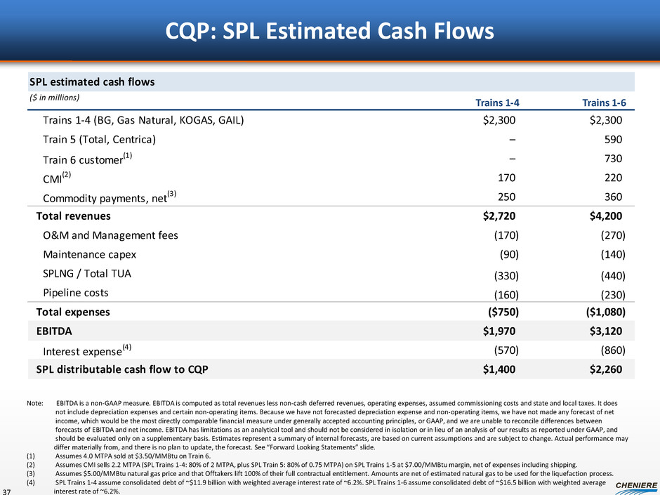 SPLNG estimated cash flows ($ in millions) Trains 1-4 Trains 1-6 Total $130 $130 Chevron 135 135 SPL (1) 295 305 Other 10 15 Total revenues $570 $585 Total expenses (70) (75) EBITDA $500 $510 Interest expense(2) (130) (130) SPLNG distributable cash flow to CQP $370 $380 CQP: SPLNG (Regas) Estimated Cash Flows 36 Note: EBITDA is a non-GAAP measure. EBITDA is computed as total revenues less non-cash deferred revenues, operating expenses, assumed commissioning costs and state and local taxes. It does not include depreciation expenses and certain non-operating items. Because we have not forecasted depreciation expense and non-operating items, we have not made any forecast of net income, which would be the most directly comparable financial measure under generally accepted accounting principles, or GAAP, and we are unable to reconcile differences between forecasts of EBITDA and net income. EBITDA has limitations as an analytical tool and should not be considered in isolation or in lieu of an analysis of our results as reported under GAAP, and should be evaluated only on a supplementary basis. Estimates represent a summary of internal forecasts, are based on current assumptions and are subject to change. Actual performance may differ materially from, and there is no plan to update, the forecast. See “Forward Looking Statements” slide. (1) Includes export fees. (2) Assumes $2.1 billion of debt outstanding at a weighted average interest rate of 6.3%.