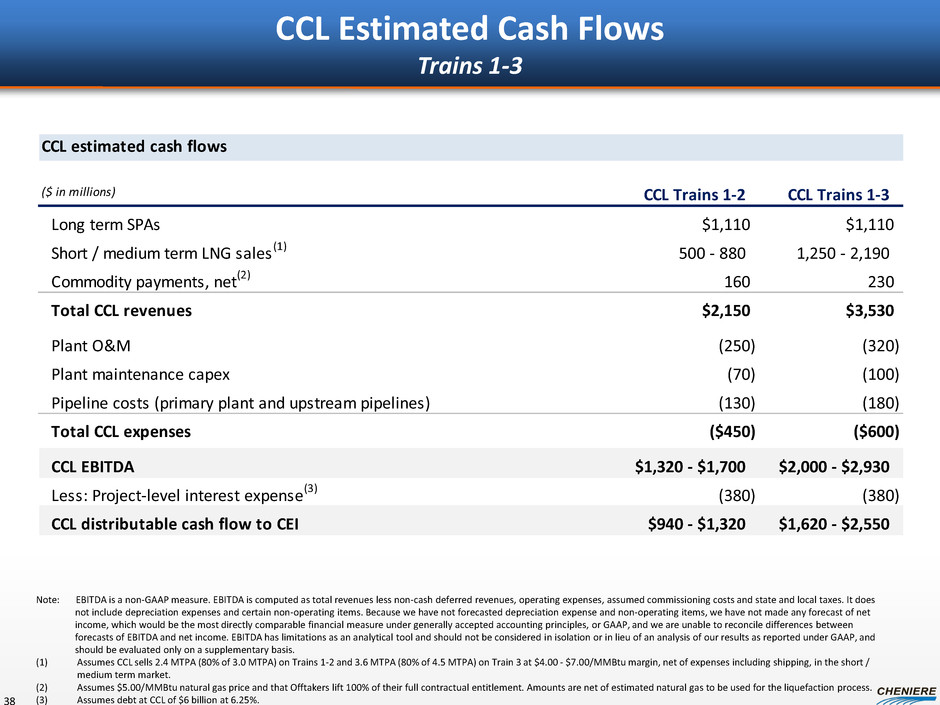 SPL estimated cash flows ($ in millions) Trains 1-4 Trains 1-6 Trains 1-4 (BG, Gas Natural, KOGAS, GAIL) $2,300 $2,300 Train 5 (Total, Centrica) – 590 Train 6 customer (1) – 730 CMI (2) 170 220 Commodity payments, net (3) 250 360 Total revenues $2,720 $4,200 O&M and Management fees (170) (270) Maintenance capex (90) (140) SPLNG / Total TUA (330) (440) Pipeline costs (160) (230) Total expenses ($750) ($1,080) EBITDA $1,970 $3,120 Interest expense (4) (570) (860) SPL distributable cash flow to CQP $1,400 $2,260 CQP: SPL Estimated Cash Flows 37 Note: EBITDA is a non-GAAP measure. EBITDA is computed as total revenues less non-cash deferred revenues, operating expenses, assumed commissioning costs and state and local taxes. It does not include depreciation expenses and certain non-operating items. Because we have not forecasted depreciation expense and non-operating items, we have not made any forecast of net income, which would be the most directly comparable financial measure under generally accepted accounting principles, or GAAP, and we are unable to reconcile differences between forecasts of EBITDA and net income. EBITDA has limitations as an analytical tool and should not be considered in isolation or in lieu of an analysis of our results as reported under GAAP, and should be evaluated only on a supplementary basis. Estimates represent a summary of internal forecasts, are based on current assumptions and are subject to change. Actual performance may differ materially from, and there is no plan to update, the forecast. See “Forward Looking Statements” slide. (1) Assumes 4.0 MTPA sold at $3.50/MMBtu on Train 6. (2) Assumes CMI sells 2.2 MTPA (SPL Trains 1-4: 80% of 2 MTPA, plus SPL Train 5: 80% of 0.75 MTPA) on SPL Trains 1-5 at $7.00/MMBtu margin, net of expenses including shipping. (3) Assumes $5.00/MMBtu natural gas price and that Offtakers lift 100% of their full contractual entitlement. Amounts are net of estimated natural gas to be used for the liquefaction process. (4) SPL Trains 1-4 assume consolidated debt of ~$11.9 billion with weighted average interest rate of ~6.2%. SPL Trains 1-6 assume consolidated debt of ~$16.5 billion with weighted average interest rate of ~6.2%.