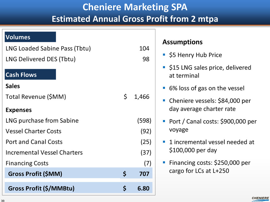 CCL estimated cash flows CMI impact ($ in millions) CCL Trains 1-2 CCL Trains 1-3 Long term SPAs $1,110 $1,110 Short / medium term LNG sales (1) 500 - 880 1,250 - 2,190 Commodity payments, net (2) 160 230 Total CCL revenues $2,150 $3,530 Plant O&M (250) (320) Plant maintenance capex (70) (100) Pipeline costs (primary plant and upstream pipelines) (130) (180) Total CCL expenses ($450) ($600) CCL EBITDA $1,320 - $1,700 $2,000 - $2,930 Less: Project-level interest expense (3) (380) (380) CCL distributable cash flow to CEI $940 - $1,320 $1,620 - $2,550 CCL Estimated Cash Flows Trains 1-3 38 Note: EBITDA is a non-GAAP measure. EBITDA is computed as total revenues less non-cash deferred revenues, operating expenses, assumed commissioning costs and state and local taxes. It does not include depreciation expenses and certain non-operating items. Because we have not forecasted depreciation expense and non-operating items, we have not made any forecast of net income, which would be the most directly comparable financial measure under generally accepted accounting principles, or GAAP, and we are unable to reconcile differences between forecasts of EBITDA and net income. EBITDA has limitations as an analytical tool and should not be considered in isolation or in lieu of an analysis of our results as reported under GAAP, and should be evaluated only on a supplementary basis. (1) Assumes CCL sells 2.4 MTPA (80% of 3.0 MTPA) on Trains 1-2 and 3.6 MTPA (80% of 4.5 MTPA) on Train 3 at $4.00 - $7.00/MMBtu margin, net of expenses including shipping, in the short / medium term market. (2) Assumes $5.00/MMBtu natural gas price and that Offtakers lift 100% of their full contractual entitlement. Amounts are net of estimated natural gas to be used for the liquefaction process. (3) Assumes debt at CCL of $6 billion at 6.25%.