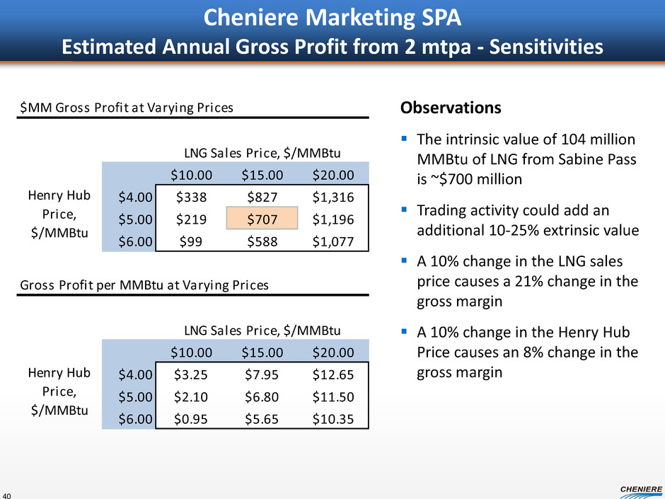 Cheniere Marketing SPA Estimated Annual Gross Profit from 2 mtpa 39 Assumptions $5 Henry Hub Price $15 LNG sales price, delivered at terminal 6% loss of gas on the vessel Cheniere vessels: $84,000 per day average charter rate Port / Canal costs: $900,000 per voyage 1 incremental vessel needed at $100,000 per day Financing costs: $250,000 per cargo for LCs at L+250 Volumes LNG Loaded Sabine Pass (Tbtu) 104 LNG Delivered DES (Tbtu) 98 Cash Flows Sales Total Revenue ($MM) 1,466$ Expenses LNG purchase from Sabine (598) Vessel Charter Costs (92) Port and Canal Costs (25) Incremental Vessel Charters (37) Financing Costs (7) Gross Profit ($MM) 707$ Gross Profit ($/MMBtu) 6.80$