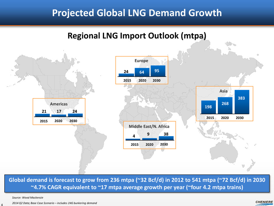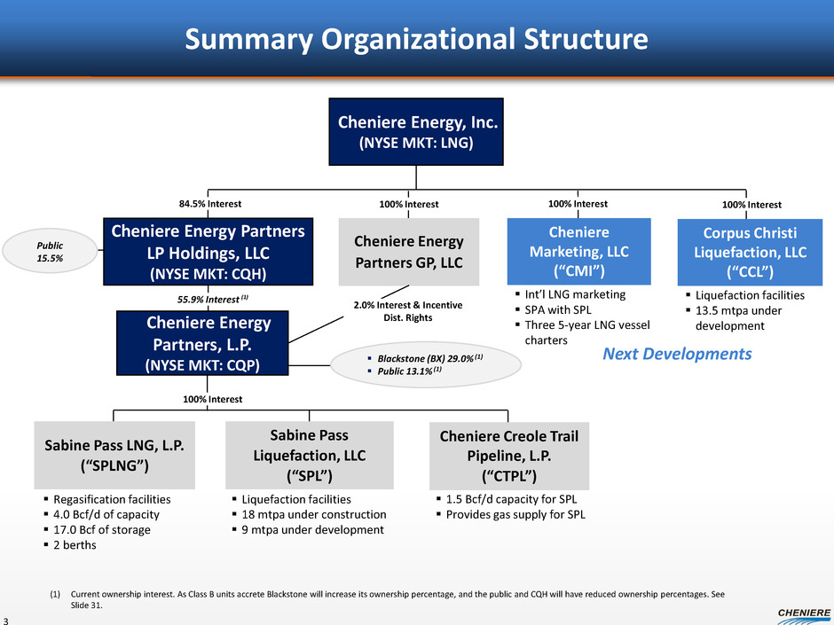 Forward Looking Statements 2 This presentation contains certain statements that are, or may be deemed to be, “forward-looking statements” within the meaning of Section 27A of the Securities Act of 1933, as amended, and Section 21E of the Securities Exchange Act of 1934, as amended. All statements, other than statements of historical facts, included herein are “forward-looking statements.” Included among “forward-looking statements” are, among other things: statements regarding the ability of Cheniere Energy Partners, L.P. to pay distributions to its unitholders or Cheniere Energy Partners LP Holdings, LLC to pay dividends to its shareholders; statements regarding Cheniere Energy Inc.’s, Cheniere Energy Partners LP Holdings, LLC’s or Cheniere Energy Partners, L.P.’s expected receipt of cash distributions from their respective subsidiaries; statements that Cheniere Energy Partners, L.P. expects to commence or complete construction of its proposed liquefaction facilities, or any expansions thereof, by certain dates or at all; statements that Cheniere Energy, Inc. expects to commence or complete construction of its proposed liquefaction facilities or other projects by certain dates or at all; statements regarding future levels of domestic and international natural gas production, supply or consumption or future levels of liquefied natural gas (“LNG”) imports into or exports from North America and other countries worldwide, regardless of the source of such information, or the transportation or demand for and prices related to natural gas, LNG or other hydrocarbon products; statements regarding any financing transactions or arrangements, or ability to enter into such transactions; statements relating to the construction of our natural gas liquefaction trains (“Trains”), or modifications to the Creole Trail Pipeline, including statements concerning the engagement of any engineering, procurement and construction ("EPC") contractor or other contractor and the anticipated terms and provisions of any agreement with any EPC or other contractor, and anticipated costs related thereto; statements regarding any agreement to be entered into or performed substantially in the future, including any revenues anticipated to be received and the anticipated timing thereof, and statements regarding the amounts of total LNG regasification, liquefaction or storage capacities that are, or may become, subject to contracts; statements regarding counterparties to our commercial contracts, construction contracts and other contracts; statements regarding our planned construction of additional Trains, including the financing of such Trains; statements that our Trains, when completed, will have certain characteristics, including amounts of liquefaction capacities; statements regarding any business strategy, our strengths, our business and operation plans or any other plans, forecasts, projections or objectives, including anticipated revenues and capital expenditures and EBITDA, any or all of which are subject to change; statements regarding projections of revenues, expenses, earnings or losses, working capital or other financial items; statements regarding legislative, governmental, regulatory, administrative or other public body actions, approvals, requirements, permits, applications, filings, investigations, proceedings or decisions; statements regarding our anticipated LNG and natural gas marketing activities; and any other statements that relate to non-historical or future information. These forward-looking statements are often identified by the use of terms and phrases such as “achieve,” “anticipate,” “believe,” “contemplate,” “develop,” “estimate,” “example,” “expect,” “forecast,” “opportunities,” “plan,” “potential,” “project,” “propose,” “subject to,” “strategy,” and similar terms and phrases, or by use of future tense. Although we believe that the expectations reflected in these forward-looking statements are reasonable, they do involve assumptions, risks and uncertainties, and these expectations may prove to be incorrect. You should not place undue reliance on these forward-looking statements, which speak only as of the date of this presentation. Our actual results could differ materially from those anticipated in these forward-looking statements as a result of a variety of factors, including those discussed in “Risk Factors” in the Cheniere Energy, Inc., Cheniere Energy Partners, L.P. and Cheniere Energy Partners LP Holdings, LLC Annual Reports on Form 10-K filed with the SEC on February 21, 2014, and Quarterly Reports on Form 10-Q filed with the SEC on July 31, 2014, which are incorporated by reference into this presentation. All forward-looking statements attributable to us or persons acting on our behalf are expressly qualified in their entirety by these ”Risk Factors”. These forward-looking statements are made as of the date of this presentation, and other than as required under the securities laws, we undertake no obligation to publicly update or revise any forward-looking statements.