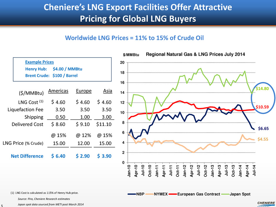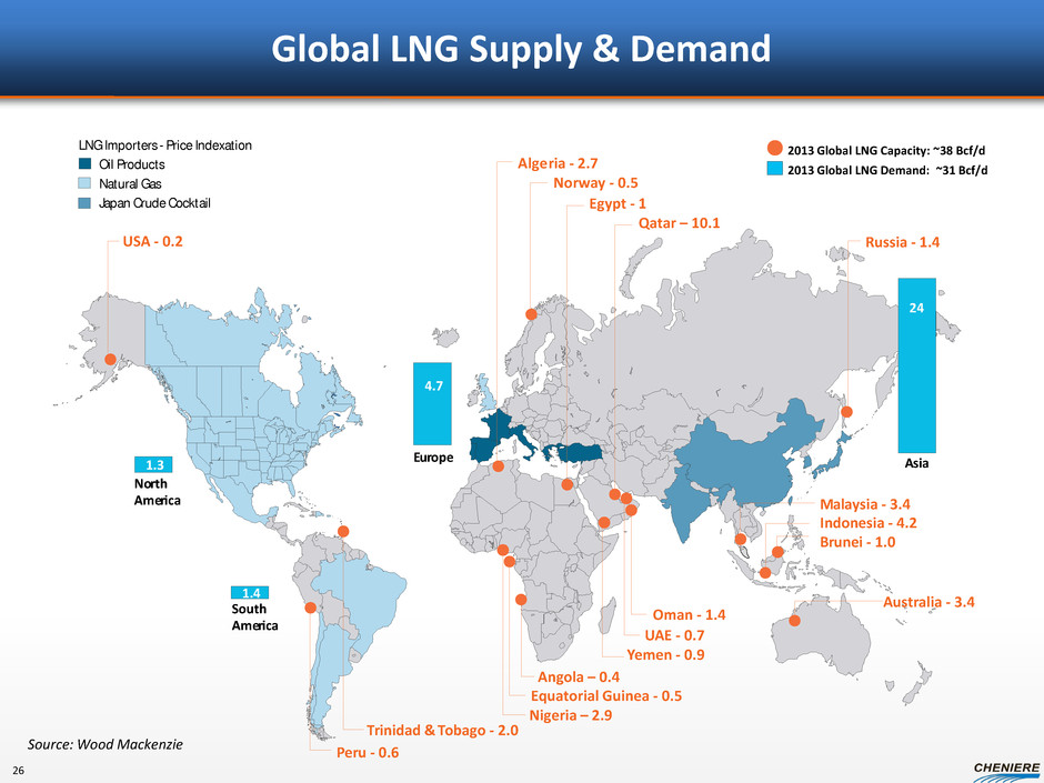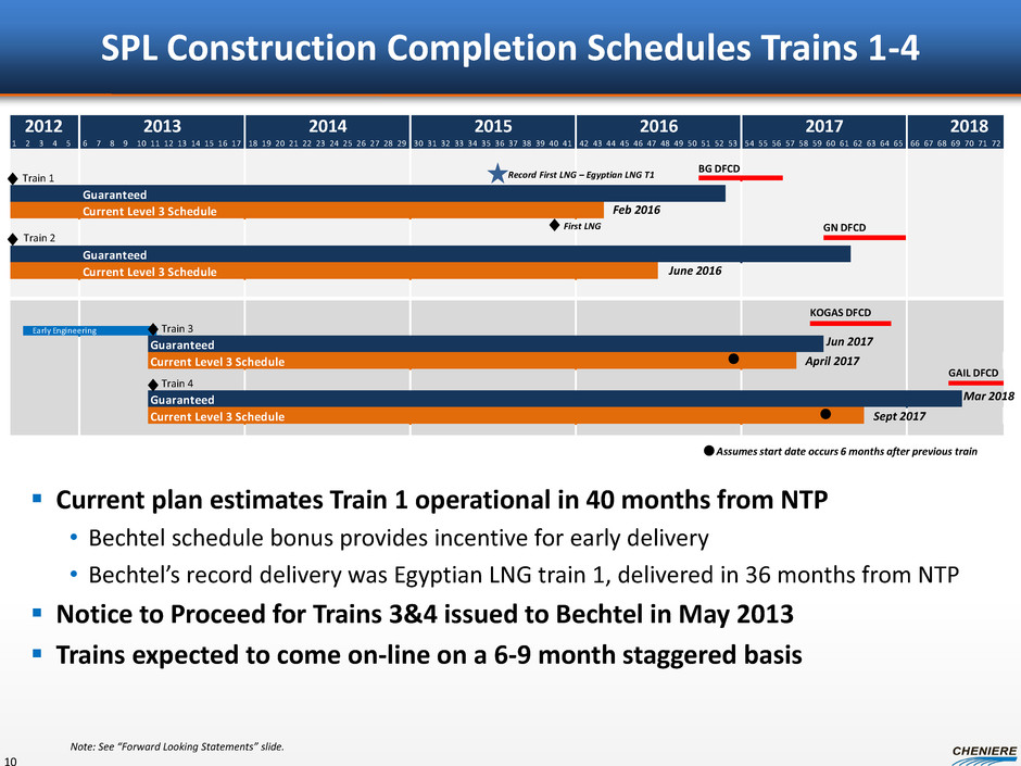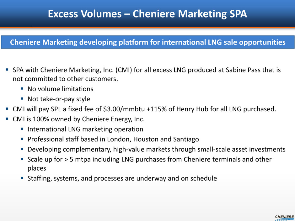 Excess Volumes – Cheniere Marketing SPA SPA with Cheniere Marketing, Inc. (CMI) for all excess LNG produced at Sabine Pass that is not committed to other customers. No volume limitations Not take-or-pay style CMI will pay SPL a fixed fee of $3.00/mmbtu +115% of Henry Hub for all LNG purchased. CMI is 100% owned by Cheniere Energy, Inc. International LNG marketing operation Professional staff based in London, Houston and Santiago Developing complementary, high-value markets through small-scale asset investments Scale up for > 5 mtpa including LNG purchases from Cheniere terminals and other places Staffing, systems, and processes are underway and on schedule Cheniere Marketing developing platform for international LNG sale opportunities