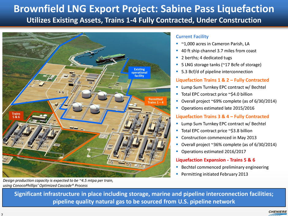 Cheniere Energy Partners’ Liquefaction Projects 6 Sabine Pass T1-4 Sabine Pass T5-6 Estimated Cost(1) $12B $6B Volume (MTPA) 18.0 9.0 3rd Party Contracts to date (MTPA) 16.0 3.75 Development Stage Under Construction Permitting/ Commercializing First LNG 2015 2018/19 6 Trains, ~$18B investment, ~27 MTPA LNG Exports (~3.5+ Bcf/d) (1) Includes financing cost estimates