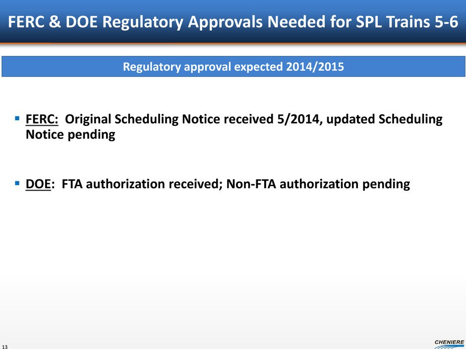 FERC & DOE Regulatory Approvals Needed for SPL Trains 5-6 FERC: Original Scheduling Notice received 5/2014, updated Scheduling Notice pending DOE: FTA authorization received; Non-FTA authorization pending 13 Regulatory approval expected 2014/2015
