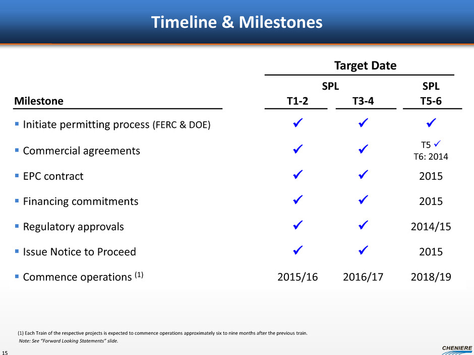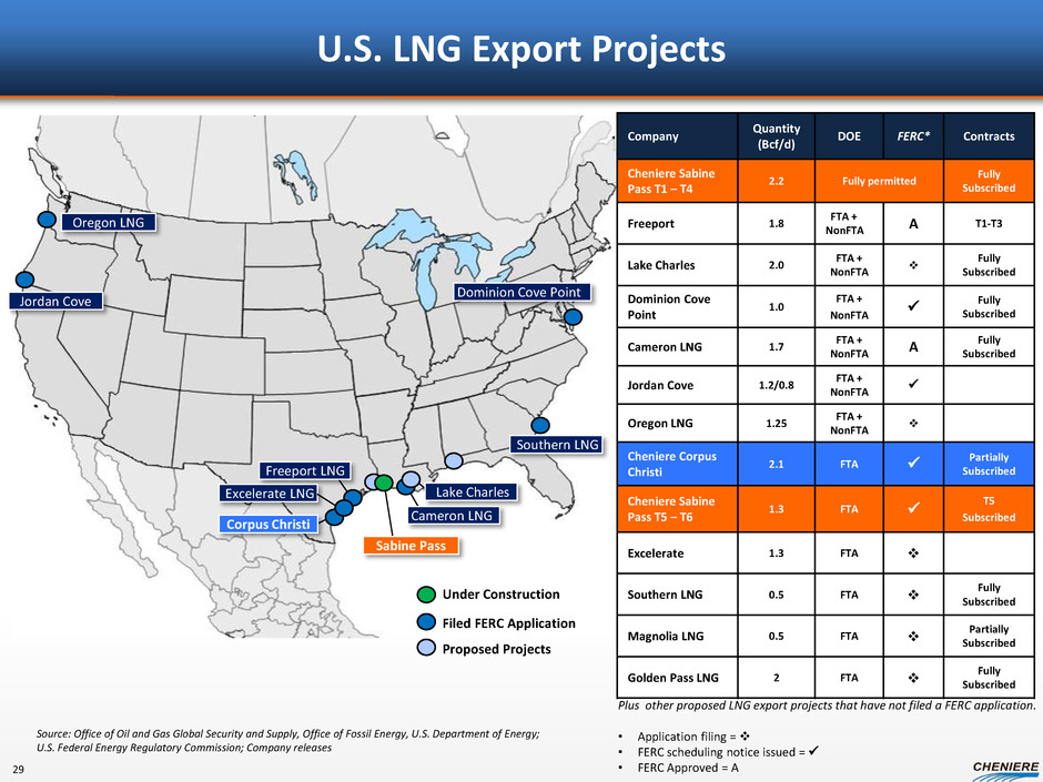 FERC Applications Filed for Liquefaction Projects Corpus Christi received FERC scheduling notice on February 12, 2014; FERC approval expected 2014/2015 SPL received initial FERC scheduling notice on May 30, 2014; revised notice pending; FERC approval expected 2014/2015 14 LNG Export Projects Pre-filing Date Application Date FERC Scheduling Notice Issued EIS / EA Scheduled Date for EIS or EA Rec’d Approval Sabine Pass Liquefaction T1-4 July 26, 2010 January 31, 2011 EA 4/16/2012 Corpus Christi Liquefaction December 13, 2011 August 31, 2012 February 12, 2014 EIS October 8, 2014 Freeport LNG December 23, 2010 August 31, 2012 January 6, 2014 EIS June 16, 2014 7/30/2014 Cameron LNG April 30, 2012 December 10, 2012 November 21, 2013 EIS April 30, 2014 6/19/2014 Dominion Cove Point LNG June 1, 2012 April 1, 2013 March 12, 2014 EA May 15, 2014 Jordan Cove Energy February 29, 2012 May 22, 2013 July 16, 2014 EIS Feb. 27, 2015 Oregon LNG July 3, 2012 June 7, 2013 EIS Sabine Pass Liquefaction T5-6 February 27, 2013 September 30, 2013 May 30, 2014 EA Excelerate November 5, 2012 February 6, 2014 EIS Southern LNG December 5, 2012 March 10, 2014 EA Lake Charles LNG March 30, 2012 March 25, 2014 EIS Magnolia LNG March 20, 2013 April 30, 2014 EIS Golden Pass LNG May 16, 2013 July 7, 2014 Note: National Environmental Policy Act (NEPA) empowers FERC as the lead Federal agency to prepare an Environmental Impact Statement in cooperation with other state and federal agencies
