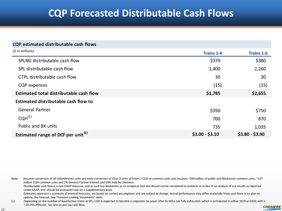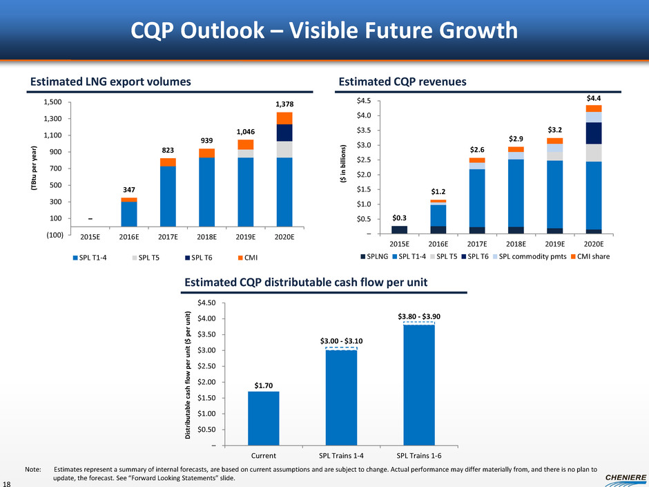 CQP estimated distributable cash flows ($ in millions) Trains 1-4 Trains 1-6 SPLNG distributable cash flow $370 $380 SPL distributable cash flow 1,400 2,260 CTPL distributable cash flow 30 30 CQP expenses (15) (15) Estimated total distributable cash flow $1,785 $2,655 Estimated distributable cash flow to General Partner $350 $750 CQH(1) 700 870 Public and BX units 735 1,035 Estimated range of DCF per unit (2) $3.00 - $3.10 $3.80 - $3.90 CQP Forecasted Distributable Cash Flows 17 Note: Assumes conversion of all subordinated units and early conversion of Class B units at Trains 2 COD to common units and assumes ~269 million of public and Blackstone common units, ~227 million CQH common units and 2% General Partner interest and IDRs held by Cheniere. Distributable cash flow is a non-GAAP measure, and as such has limitations as an analytical tool and should not be considered in isolation or in lieu of an analysis of our results as reported under GAAP, and should be evaluated only on a supplementary basis. Estimates represent a summary of internal forecasts, are based on current assumptions and are subject to change. Actual performance may differ materially from, and there is no plan to update, the forecast. See “Forward Looking Statements” slide. (1) Depending on the number of liquefaction trains at SPL, CQH is expected to become a corporate tax payer after its NOLs are fully exhausted, which is anticipated in either 2019 or 2020, with a ~20-25% effective tax rate on pre-tax cash flow.