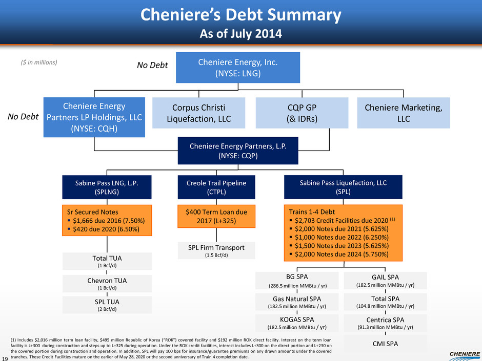 $0.3 $1.2 $2.6 $2.9 $3.2 $4.4 – $0.5 $1.0 $1.5 $2.0 $2.5 $3.0 $3.5 $4.0 $4.5 2015E 2016E 2017E 2018E 2019E 2020E ($ in bil lio ns ) SPLNG SPL T1-4 SPL T5 SPL T6 SPL commodity pmts CMI share – 347 823 939 1,046 1,378 (100) 100 300 500 700 900 1,100 1,300 1,500 2015E 2016E 2017E 2018E 2019E 2020E (TB tu pe r y ea r) SPL T1-4 SPL T5 SPL T6 CMI CQP Outlook – Visible Future Growth 18 Note: Estimates represent a summary of internal forecasts, are based on current assumptions and are subject to change. Actual performance may differ materially from, and there is no plan to update, the forecast. See “Forward Looking Statements” slide. Estimated LNG export volumes Estimated CQP revenues Estimated CQP distributable cash flow per unit $1.70 $3.00 - $3.10 $3.80 - $3.90 – $0.50 $1.00 $1.50 $2.00 $2.50 $3.00 $3.50 $4.00 $4.50 Current SPL Trains 1-4 SPL Trains 1-6 Di str ibu ta ble cas h f low pe r u nit ($ pe r u nit )
