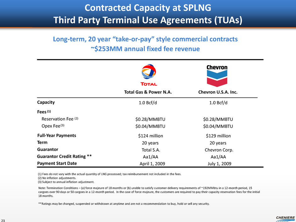 Contracted Capacity at SPLNG Third Party Terminal Use Agreements (TUAs) 23 Long-term, 20 year “take-or-pay” style commercial contracts ~$253MM annual fixed fee revenue Total Gas & Power N.A. Chevron U.S.A. Inc. Capacity 1.0 Bcf/d 1.0 Bcf/d Fees (1) Reservation Fee (2) $0.28/MMBTU $0.28/MMBTU Opex Fee (3) $0.04/MMBTU $0.04/MMBTU Full-Year Payments $124 million $129 million Term 20 years 20 years Guarantor Total S.A. Chevron Corp. Guarantor Credit Rating ** Aa1/AA Aa1/AA Payment Start Date April 1, 2009 July 1, 2009 (1) Fees do not vary with the actual quantity of LNG processed; tax reimbursement not included in the fees. (2) No inflation adjustments. (3) Subject to annual inflation adjustment. Note: Termination Conditions – (a) force majeure of 18 months or (b) unable to satisfy customer delivery requirements of ~192MMbtu in a 12-month period, 15 cargoes over 90 days or 50 cargoes in a 12-month period. In the case of force majeure, the customers are required to pay their capacity reservation fees for the initial 18 months. **Ratings may be changed, suspended or withdrawn at anytime and are not a recommendation to buy, hold or sell any security.