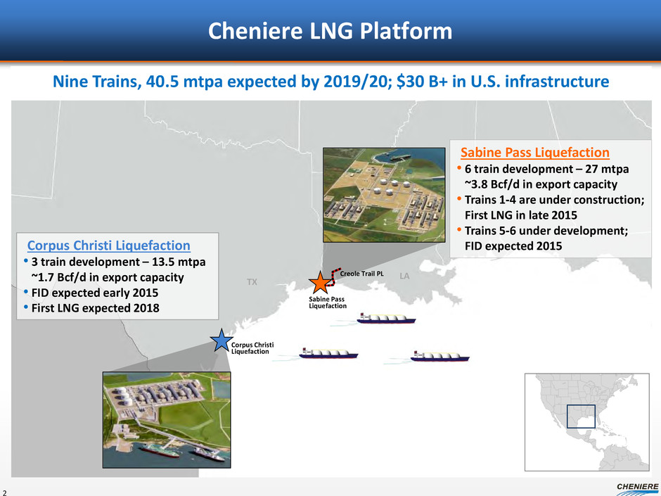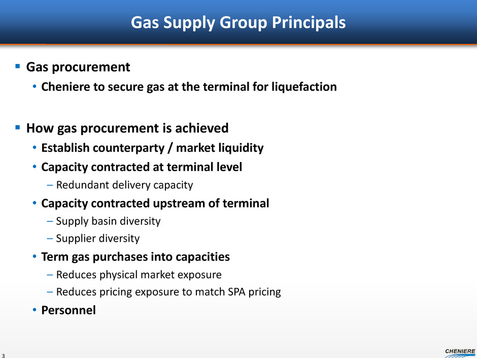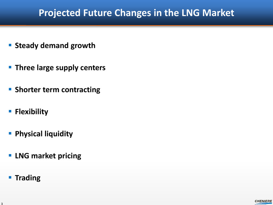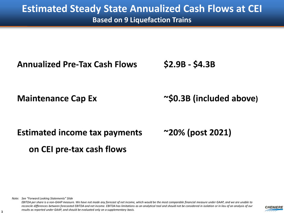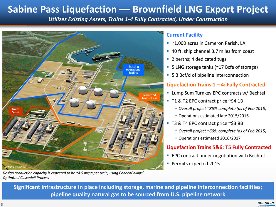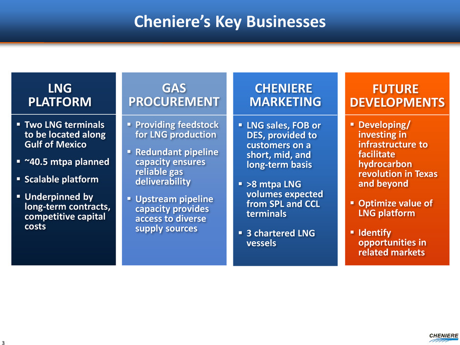 Forward Looking Statements 2 This presentation contains certain statements that are, or may be deemed to be, “forward-looking statements” within the meaning of Section 27A of the Securities Act of 1933, as amended, and Section 21E of the Securities Exchange Act of 1934, as amended. All statements, other than statements of historical facts, included herein are “forward-looking statements.” Included among “forward-looking statements” are, among other things: statements regarding the ability of Cheniere Energy Partners, L.P. to pay distributions to its unitholders or Cheniere Energy Partners LP Holdings, LLC to pay dividends to its shareholders; statements regarding Cheniere Energy Inc.’s, Cheniere Energy Partners LP Holdings, LLC’s or Cheniere Energy Partners, L.P.’s expected receipt of cash distributions from their respective subsidiaries; statements that Cheniere Energy Partners, L.P. expects to commence or complete construction of its proposed liquefied natural gas (“LNG”) terminals, liquefaction facilities, pipeline facilities or other projects, or any expansions thereof, by certain dates or at all; statements that Cheniere Energy, Inc. expects to commence or complete construction of its proposed LNG terminals, liquefaction facilities, pipeline facilities or other projects by certain dates or at all; statements regarding future levels of domestic and international natural gas production, supply or consumption or future levels of LNG imports into or exports from North America and other countries worldwide, or purchases of natural gas, regardless of the source of such information, or the transportation or other infrastructure, or demand for and prices related to natural gas, LNG or other hydrocarbon products; statements regarding any financing transactions or arrangements, or ability to enter into such transactions; statements relating to the construction of our proposed liquefaction facilities and natural gas liquefaction trains (“Trains”), or modifications to the Creole Trail Pipeline, including statements concerning the engagement of any engineering, procurement and construction ("EPC") contractor or other contractor and the anticipated terms and provisions of any agreement with any EPC or other contractor, and anticipated costs related thereto; statements regarding any agreement to be entered into or performed substantially in the future, including any revenues anticipated to be received and the anticipated timing thereof, and statements regarding the amounts of total LNG regasification, liquefaction or storage capacities that are, or may become, subject to contracts; statements regarding counterparties to our commercial contracts, construction contracts and other contracts; statements regarding our planned construction of additional Trains, including the financing of such Trains; statements that our Trains, when completed, will have certain characteristics, including amounts of liquefaction capacities; statements regarding our business strategy, our strengths, our business and operation plans or any other plans, forecasts, projections or objectives, including anticipated revenues and capital expenditures and EBITDA, any or all of which are subject to change; statements regarding projections of revenues, expenses, earnings or losses, working capital or other financial items; statements regarding legislative, governmental, regulatory, administrative or other public body actions, approvals, requirements, permits, applications, filings, investigations, proceedings or decisions; statements regarding our anticipated LNG and natural gas marketing activities; and any other statements that relate to non-historical or future information. These forward-looking statements are often identified by the use of terms and phrases such as “achieve,” “anticipate,” “believe,” “contemplate,” “develop,” “estimate,” “example,” “expect,” “forecast,” “goal,” “opportunities,” “plan,” “potential,” “project,” “propose,” “subject to,” “strategy,” “target,” and similar terms and phrases, or by use of future tense. Although we believe that the expectations reflected in these forward-looking statements are reasonable, they do involve assumptions, risks and uncertainties, and these expectations may prove to be incorrect. You should not place undue reliance on these forward-looking statements, which speak only as of the date of this presentation. Our actual results could differ materially from those anticipated in these forward-looking statements as a result of a variety of factors, including those discussed in “Risk Factors” in the Cheniere Energy, Inc., Cheniere Energy Partners, L.P. and Cheniere Energy Partners LP Holdings, LLC Annual Reports on Form 10-K filed with the SEC on February 20, 2015, which are incorporated by reference into this presentation. All forward-looking statements attributable to us or persons acting on our behalf are expressly qualified in their entirety by these ”Risk Factors.” These forward-looking statements are made as of the date of this presentation, and other than as required under the securities laws, we undertake no obligation to publicly update or revise any forward-looking statements.
