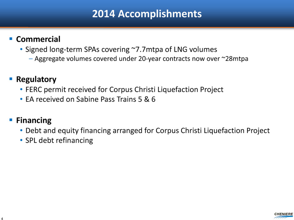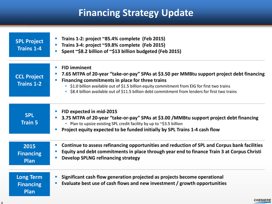 Cheniere’s Key Businesses Two LNG terminals to be located along Gulf of Mexico ~40.5 mtpa planned Scalable platform Underpinned by long-term contracts, competitive capital costs LNG sales, FOB or DES, provided to customers on a short, mid, and long-term basis >8 mtpa LNG volumes expected from SPL and CCL terminals 3 chartered LNG vessels Developing/ investing in infrastructure to facilitate hydrocarbon revolution in Texas and beyond Optimize value of LNG platform Identify opportunities in related markets Providing feedstock for LNG production Redundant pipeline capacity ensures reliable gas deliverability Upstream pipeline capacity provides access to diverse supply sources LNG PLATFORM GAS PROCUREMENT CHENIERE MARKETING FUTURE DEVELOPMENTS 3