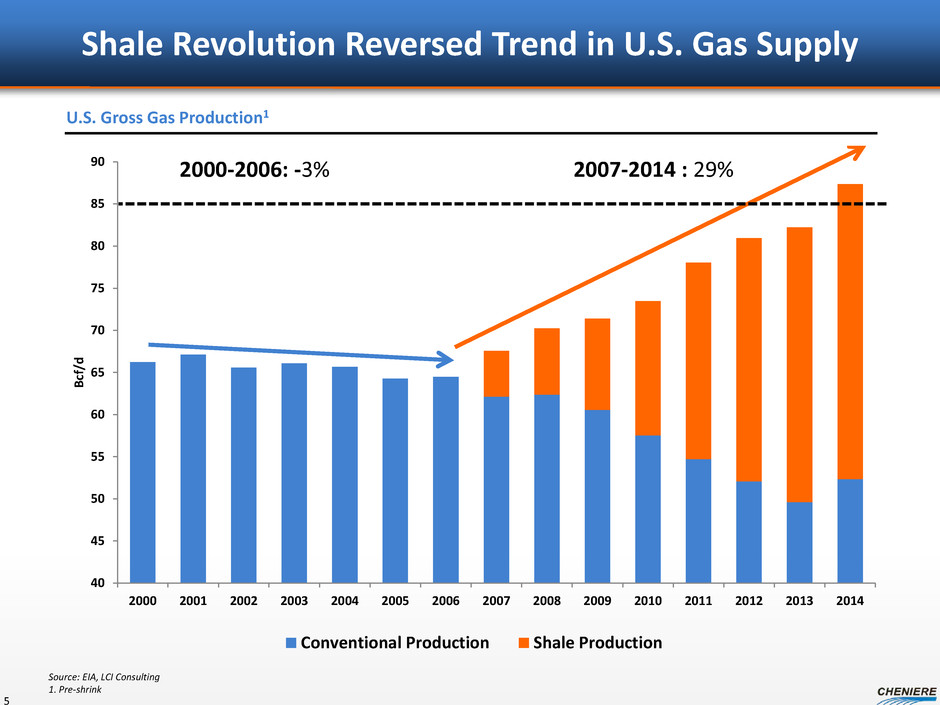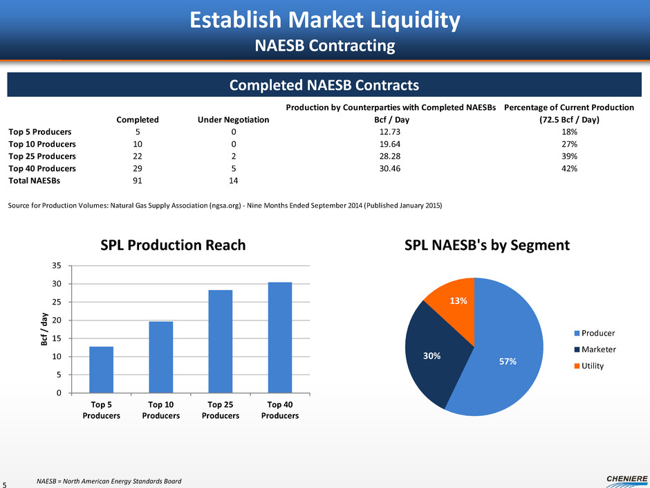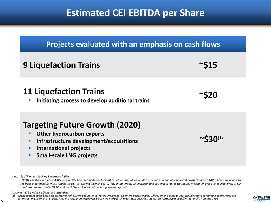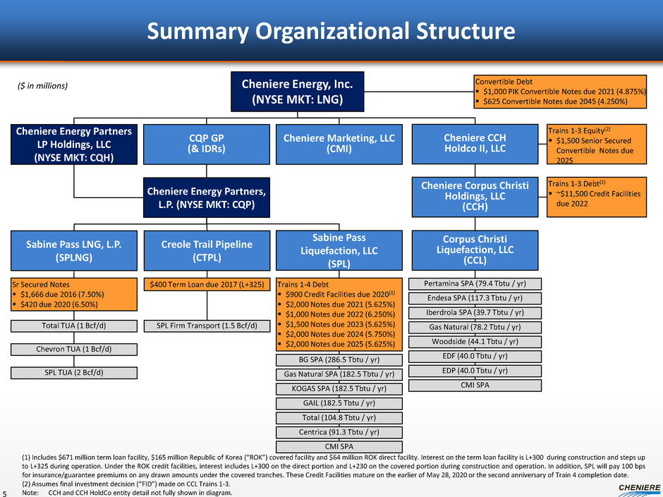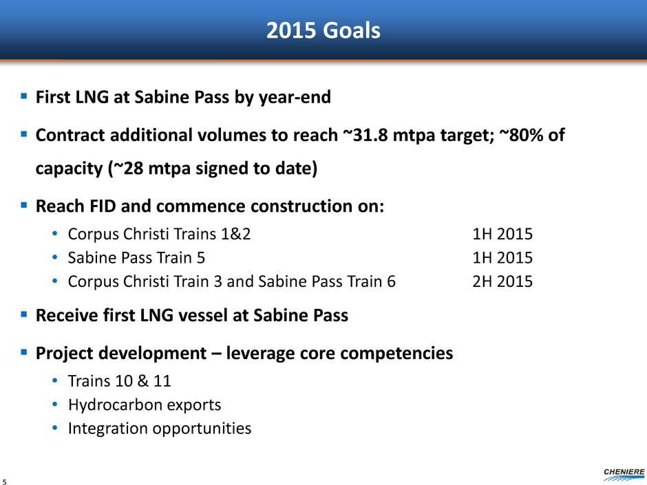 2014 Accomplishments Commercial • Signed long-term SPAs covering ~7.7mtpa of LNG volumes – Aggregate volumes covered under 20-year contracts now over ~28mtpa Regulatory • FERC permit received for Corpus Christi Liquefaction Project • EA received on Sabine Pass Trains 5 & 6 Financing • Debt and equity financing arranged for Corpus Christi Liquefaction Project • SPL debt refinancing 4