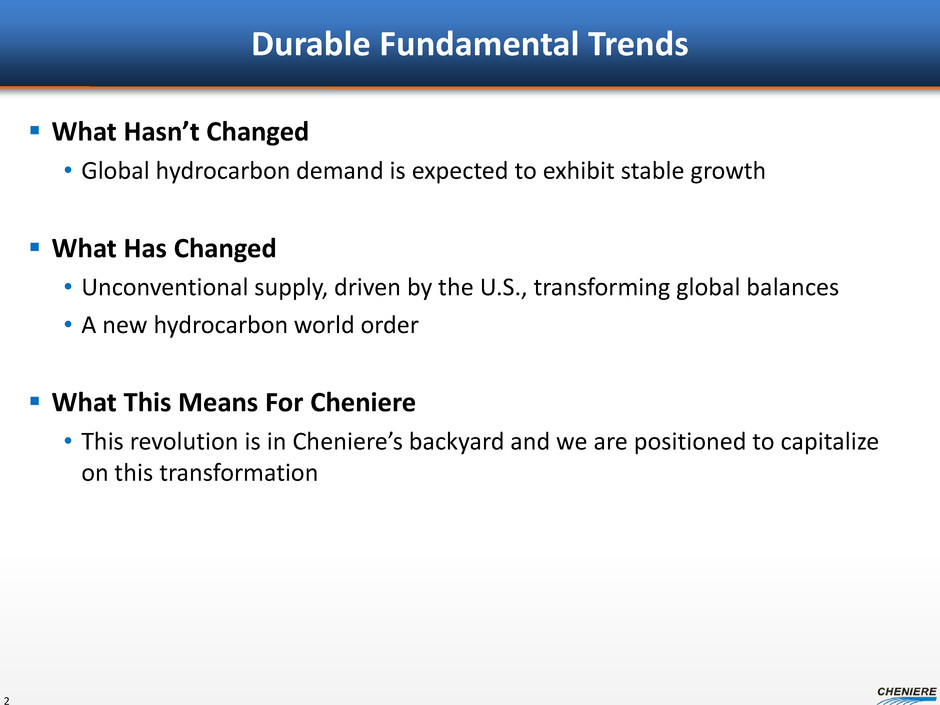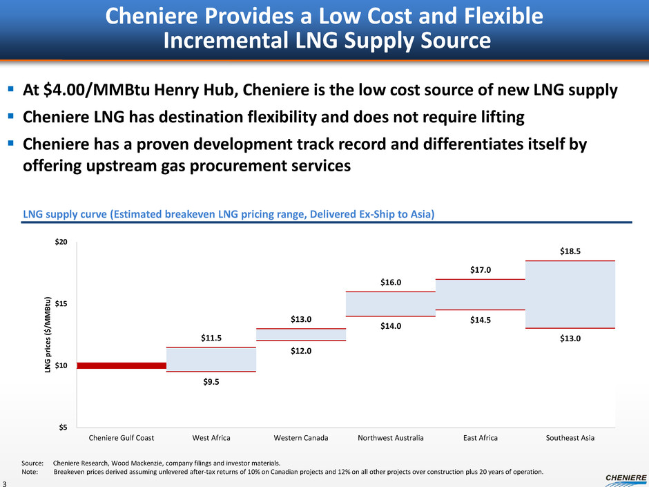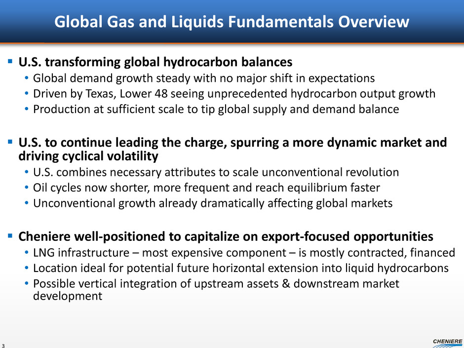 Durable Fundamental Trends What Hasn’t Changed • Global hydrocarbon demand is expected to exhibit stable growth What Has Changed • Unconventional supply, driven by the U.S., transforming global balances • A new hydrocarbon world order What This Means For Cheniere • This revolution is in Cheniere’s backyard and we are positioned to capitalize on this transformation 2
