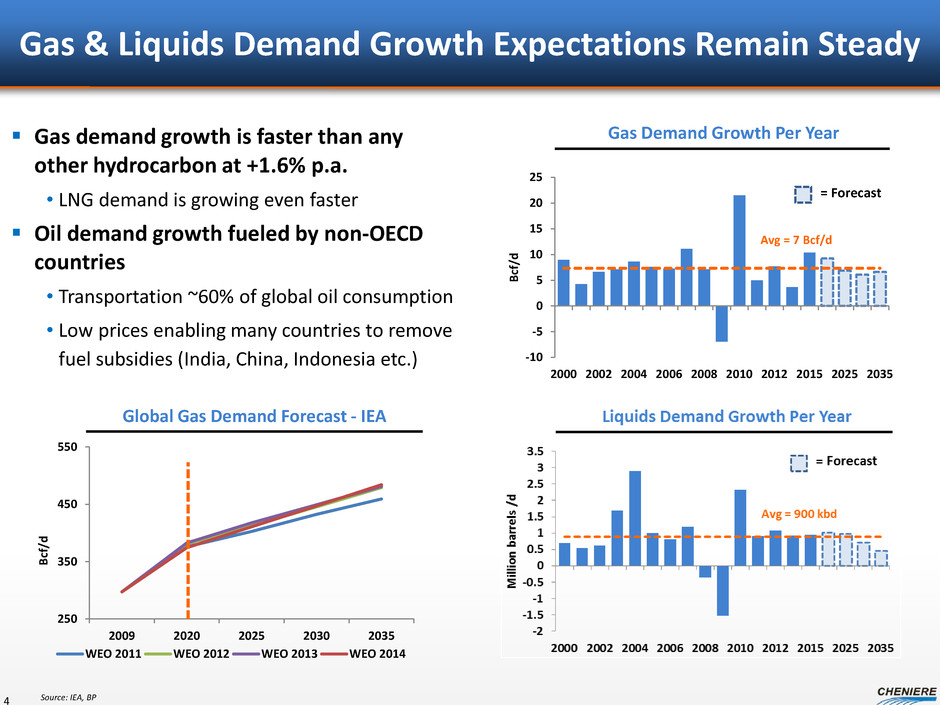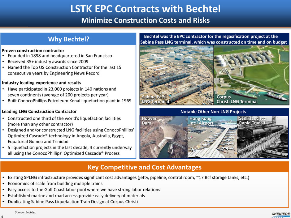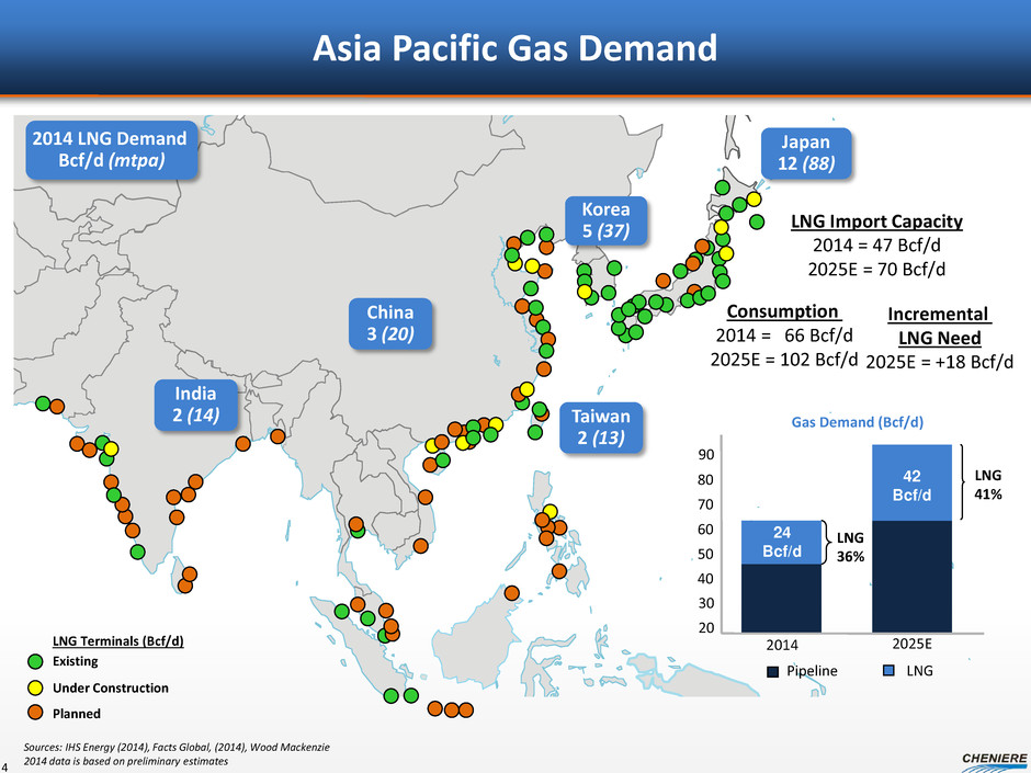 $9.5 $12.0 $14.0 $14.5 $13.0$11.5 $13.0 $16.0 $17.0 $18.5 $5 $10 $15 $20 Cheniere Gulf Coast West Africa Western Canada Northwest Australia East Africa Southeast Asia LN G p ri ce s ($ /M M B tu ) Cheniere Provides a Low Cost and Flexible Incremental LNG Supply Source At $4.00/MMBtu Henry Hub, Cheniere is the low cost source of new LNG supply Cheniere LNG has destination flexibility and does not require lifting Cheniere has a proven development track record and differentiates itself by offering upstream gas procurement services 3 LNG supply curve (Estimated breakeven LNG pricing range, Delivered Ex-Ship to Asia) Source: Cheniere Research, Wood Mackenzie, company filings and investor materials. Note: Breakeven prices derived assuming unlevered after-tax returns of 10% on Canadian projects and 12% on all other projects over construction plus 20 years of operation.