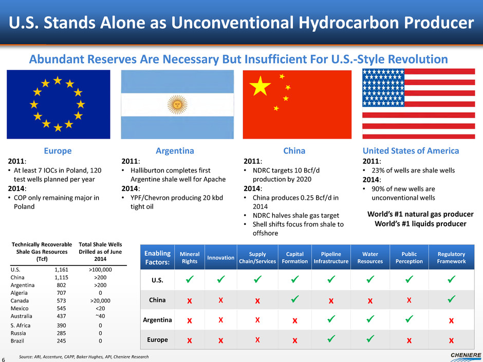 2015 Goals First LNG at Sabine Pass by year-end Contract additional volumes to reach ~31.8 mtpa target; ~80% of capacity (~28 mtpa signed to date) Reach FID and commence construction on: • Corpus Christi Trains 1&2 1H 2015 • Sabine Pass Train 5 1H 2015 • Corpus Christi Train 3 and Sabine Pass Train 6 2H 2015 Receive first LNG vessel at Sabine Pass Project development – leverage core competencies • Trains 10 & 11 • Hydrocarbon exports • Integration opportunities 5