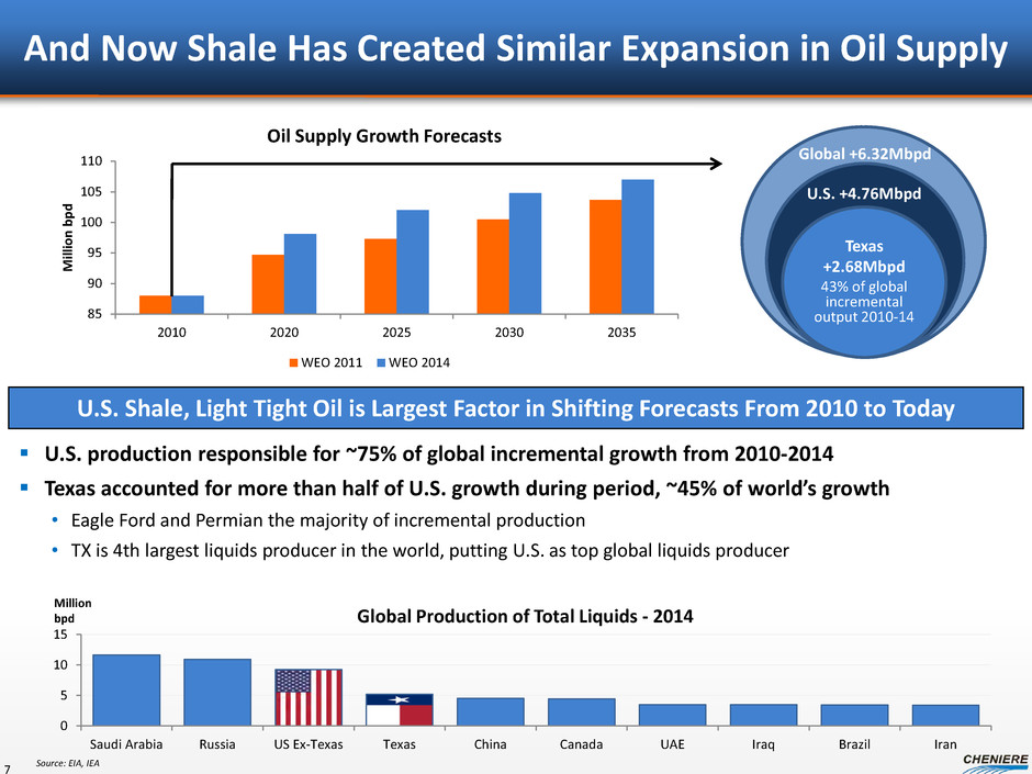 U.S. Stands Alone as Unconventional Hydrocarbon Producer 6 Technically Recoverable Shale Gas Resources (Tcf) Total Shale Wells Drilled as of June 2014 U.S. 1,161 >100,000 China 1,115 >200 Argentina 802 >200 Algeria 707 0 Canada 573 >20,000 Mexico 545 <20 Australia 437 ~40 S. Africa 390 0 Russia 285 0 Brazil 245 0 Source: ARI, Accenture, CAPP, Baker Hughes, API, Cheniere Research Enabling Factors: Mineral Rights Innovation Supply Chain/Services Capital Formation Pipeline Infrastructure Water Resources Public Perception Regulatory Framework U.S. China x X x x x X Argentina x X X x x Europe x x X x x x Europe 2011: • At least 7 IOCs in Poland, 120 test wells planned per year 2014: • COP only remaining major in Poland Argentina 2011: • Halliburton completes first Argentine shale well for Apache 2014: • YPF/Chevron producing 20 kbd tight oil China 2011: • NDRC targets 10 Bcf/d production by 2020 2014: • China produces 0.25 Bcf/d in 2014 • NDRC halves shale gas target • Shell shifts focus from shale to offshore United States of America 2011: • 23% of wells are shale wells 2014: • 90% of new wells are unconventional wells Abundant Reserves Are Necessary But Insufficient For U.S.-Style Revolution World’s #1 natural gas producer World’s #1 liquids producer