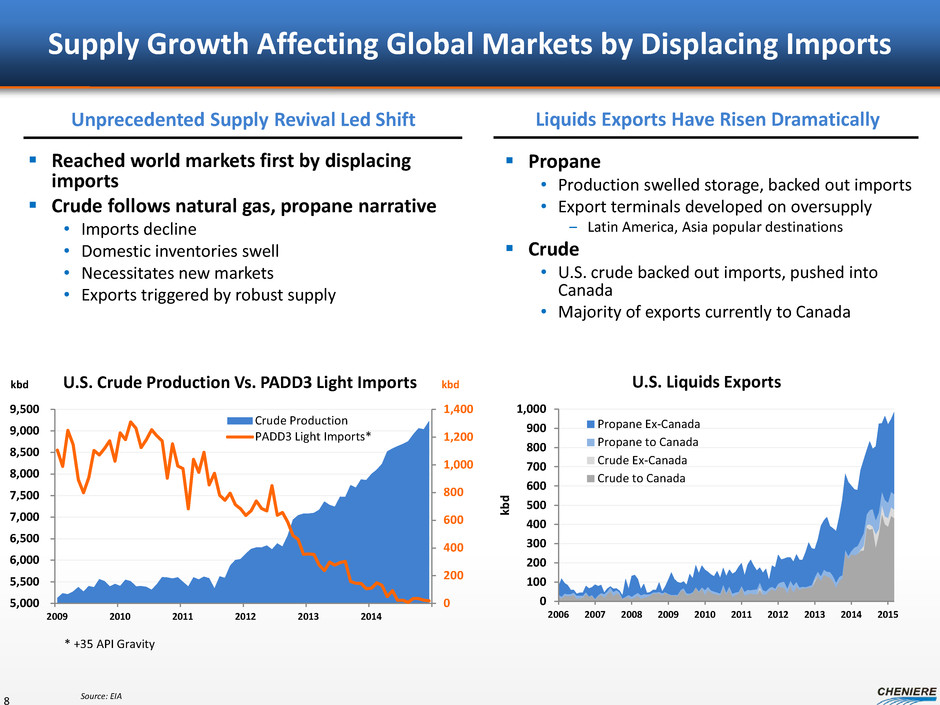 Next Proposed Development – Other Hydrocarbon Exports Developing Project in Texas along Gulf Coast 7 Estimated investment opportunity up to $2B • Initial investment expected up to $1B, initial commercialization ~200kbpd Export up to 1 MMbpd liquid hydrocarbons Capture WTI-Brent spread Initial development expected to be supported with 3rd party contracts • In discussions with potential customers for contracting capacity Regulatory process fairly straightforward Estimated start of operations: 2017 Connecting domestic liquids to international markets