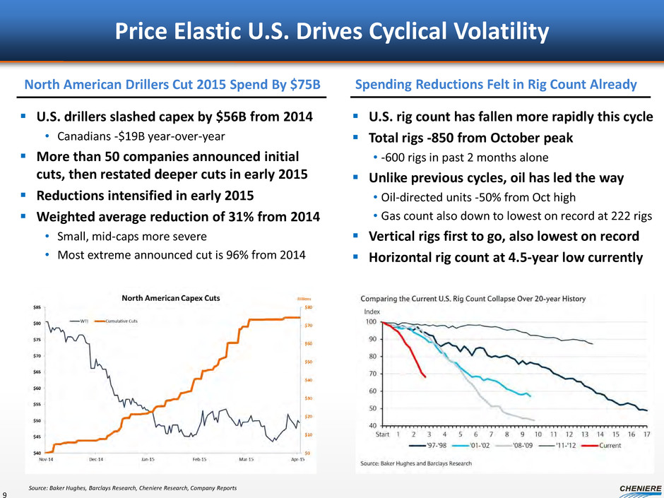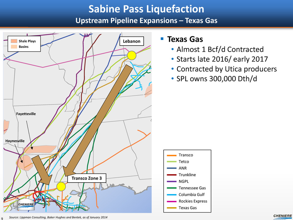 Sabine Pass Supply – Terminal Capacity 8 Sabine Pass Gas procurement • Cheniere to secure gas at the terminal for liquefaction How gas procurement is achieved • Establish counterparty / market liquidity • Capacity contracted at terminal level – Redundant delivery capacity • Capacity contracted upstream of terminal – Supply basin diversity – Supplier diversity • Term gas purchases into capacities – Reduces physical market exposure – Reduces pricing exposure to match SPA pricing • Personnel
