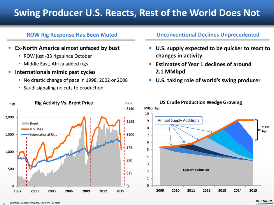 Price Elastic U.S. Drives Cyclical Volatility 9 U.S. drillers slashed capex by $56B from 2014 • Canadians -$19B year-over-year More than 50 companies announced initial cuts, then restated deeper cuts in early 2015 Reductions intensified in early 2015 Weighted average reduction of 31% from 2014 • Small, mid-caps more severe • Most extreme announced cut is 96% from 2014 U.S. rig count has fallen more rapidly this cycle Total rigs -850 from October peak • -600 rigs in past 2 months alone Unlike previous cycles, oil has led the way • Oil-directed units -50% from Oct high • Gas count also down to lowest on record at 222 rigs Vertical rigs first to go, also lowest on record Horizontal rig count at 4.5-year low currently Spending Reductions Felt in Rig Count Already North American Drillers Cut 2015 Spend By $75B Source: Baker Hughes, Barclays Research, Cheniere Research, Company Reports