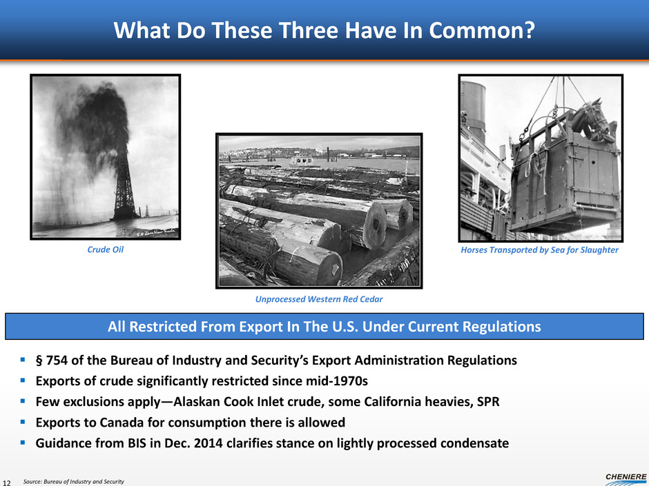 What Do These Three Have In Common? § 754 of the Bureau of Industry and Security’s Export Administration Regulations Exports of crude significantly restricted since mid-1970s Few exclusions apply—Alaskan Cook Inlet crude, some California heavies, SPR Exports to Canada for consumption there is allowed Guidance from BIS in Dec. 2014 clarifies stance on lightly processed condensate 12 Crude Oil Unprocessed Western Red Cedar Horses Transported by Sea for Slaughter Source: Bureau of Industry and Security All Restricted From Export In The U.S. Under Current Regulations