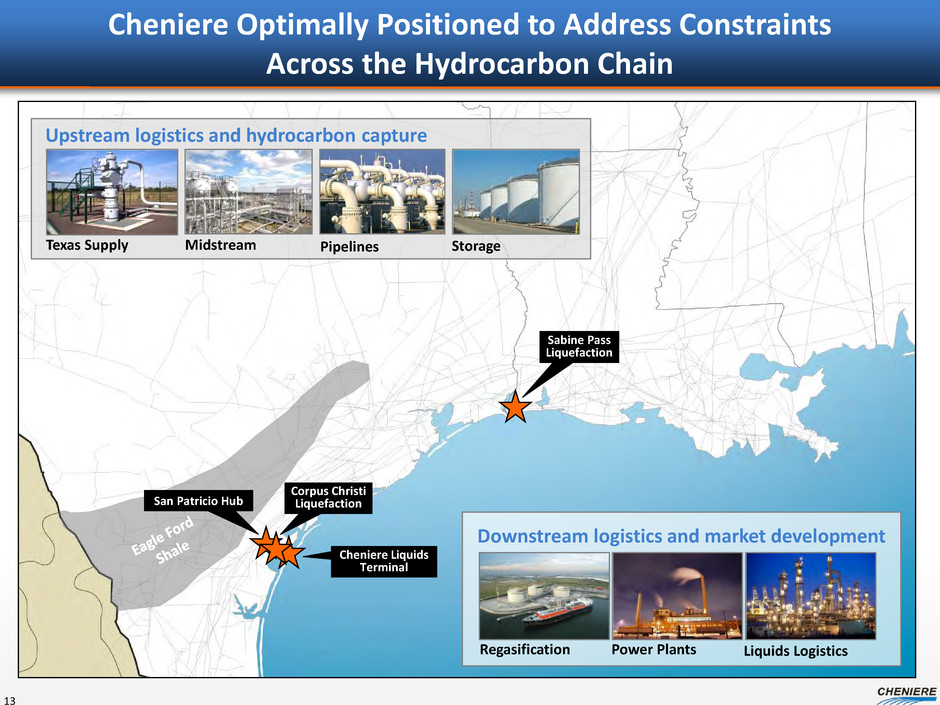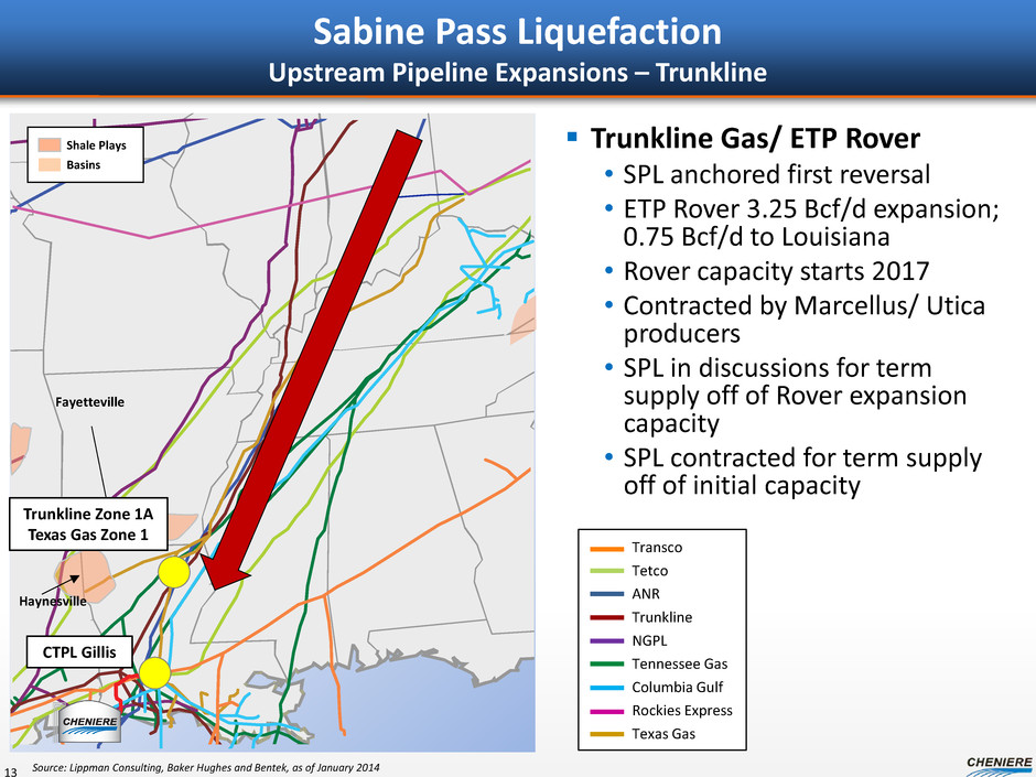Sabine Pass Liquefaction Upstream Pipeline Expansions – Texas Eastern Texas Eastern Transmission • 3 Expansion Projects contracted • Total expansion capacity to South Louisiana is 1.7 Bcf/d • 1st Capacity started Nov 2014 • Contracted by Marcellus producers • SPL has contracted for term purchases off of expansion capacity 12 Transco Tetco ANR Trunkline NGPL Tennessee Gas Columbia Gulf Rockies Express Texas Gas Source: Lippman Consulting, Baker Hughes and Bentek, as of January 2014 Haynesville Fayetteville CTPL Gillis Shale Plays Basins Haynesville