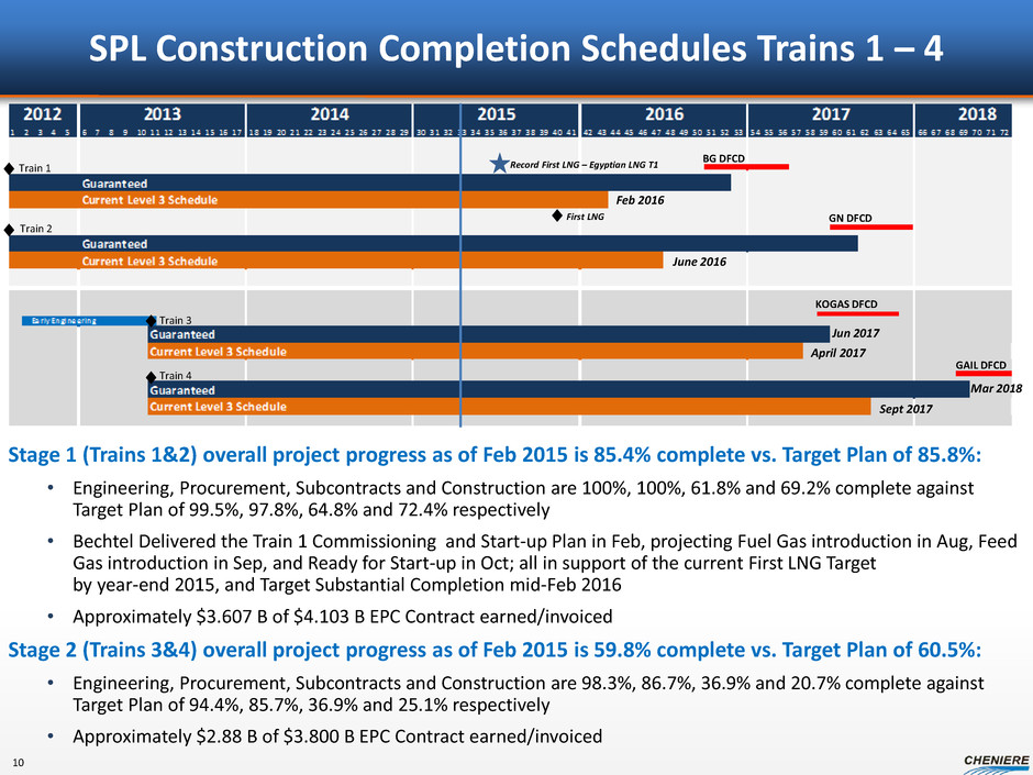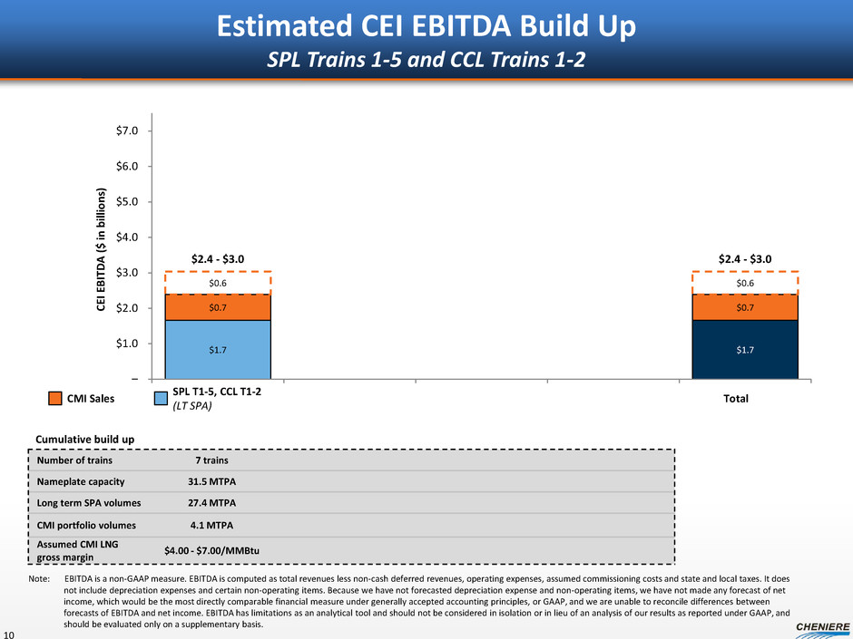 CEI EBITDA build up ($ in billions, except per unit amounts or unless otherwise noted) + SPL T5, CCL T1-2 SPL T1-5, CCL T1-2 CQH distributions(1) +$0.1 $0.5 CQP GP and IDR distributions +0.1 0.5 Management fees +0.0 0.1 CMI profit (after SPA payment) +0.1 - 0.4 0.2 - 0.9 CCL Trains 1-2 EBITDA +1.3 1.3 CEI revenues +1.6 - 2.0 $2.6 - $3.3 Less: G&A – (0.2) CEI EBITDA +1.6 - 2.0 $2.4 - $3.0 Less: CCL project-level interest expense(2) (0.5) (0.5) CEI pre-tax cash flow(3) +1.1 - 1.4 $1.8 - $2.4 Estimated CEI Cash Flows SPL Trains 1-5, CCL Trains 1-2 9 $2.4 - $3.0 billion of EBITDA to CEI with SPL Trains 1-5, CCL Trains 1-2 Estimated income tax payments of ~20% of CEI pre-tax cash flow, projected to start in 2020/2021 Note: EBITDA is a non-GAAP measure. EBITDA is computed as total revenues less non-cash deferred revenues, operating expenses, assumed commissioning costs and state and local taxes. It does not include depreciation expenses and certain non-operating items. Because we have not forecasted depreciation expense and non-operating items, we have not made any forecast of net income, which would be the most directly comparable financial measure under generally accepted accounting principles, or GAAP, and we are unable to reconcile differences between forecasts of EBITDA and net income. EBITDA has limitations as an analytical tool and should not be considered in isolation or in lieu of an analysis of our results as reported under GAAP, and should be evaluated only on a supplementary basis. (1) Based on ~80% CEI ownership interest and after NOL exhaustion at CQH. (2) Assumes CCL project-level debt of ~$8.4 billion at 6.0% annual interest rate. (3) CEI pre-tax cash flow is a non-GAAP measure. It is computed as EBITDA, adjusted for the assumption of the conversion of all CEI and CCH convertible debt and includes annual estimate for development capital spend of ~$50 million. Because we have not forecasted depreciation expense and non-operating items, we have not made any forecast of net income, which would be the most directly comparable financial measure under generally accepted accounting principles, or GAAP, and we are unable to reconcile differences between forecasts of EBITDA and net income. EBITDA has limitations as an analytical tool and should not be considered in isolation or in lieu of an analysis of our results as reported under GAAP, and should be evaluated only on a supplementary basis.