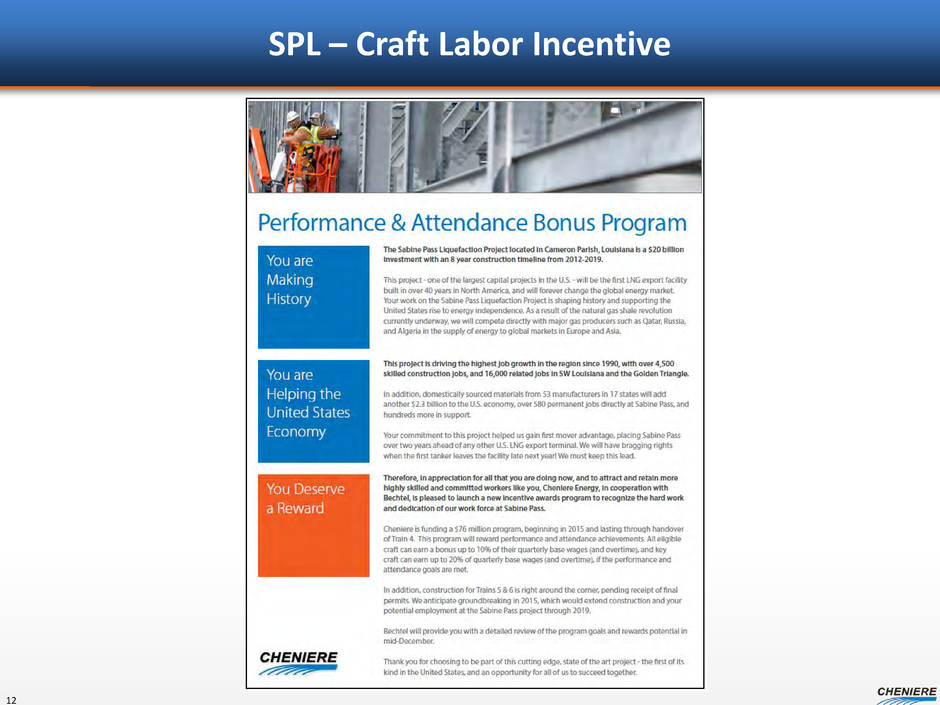 SPL – Construction Manpower 11 Over 31 million construction man hours; $1.7 billion in construction wages Train 1 – 4 Workforce peaking on site now at ~4,400