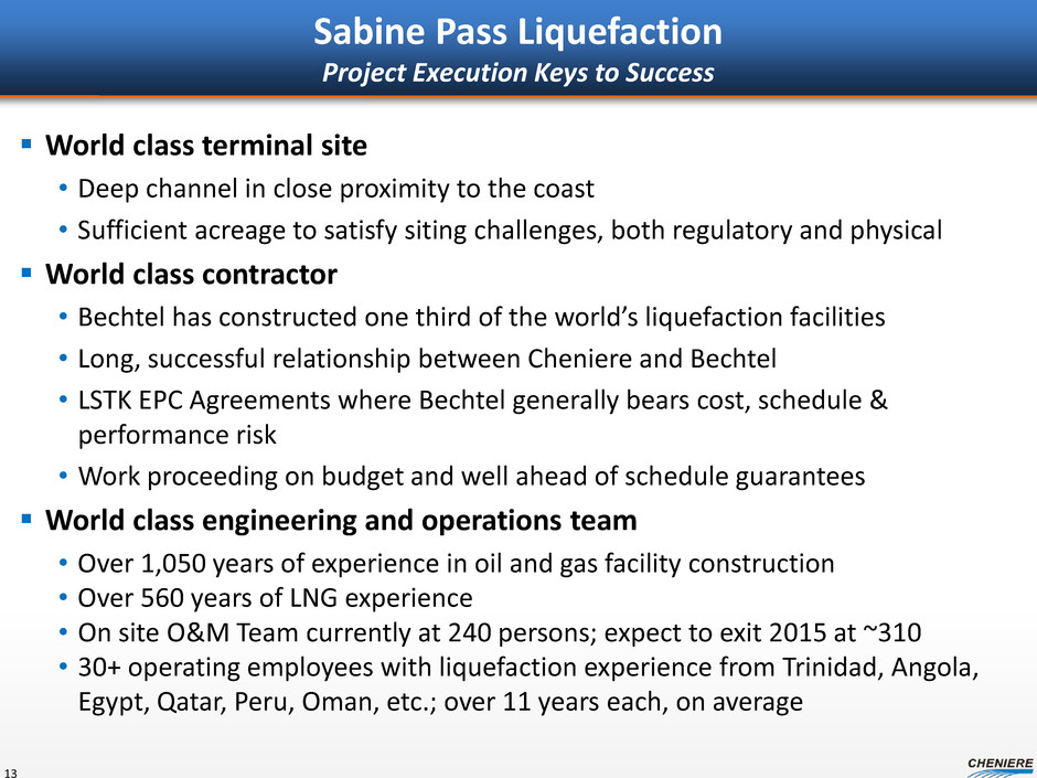 Sabine Pass Liquefaction Project Execution Keys to Success World class terminal site • Deep channel in close proximity to the coast • Sufficient acreage to satisfy siting challenges, both regulatory and physical World class contractor • Bechtel has constructed one third of the world’s liquefaction facilities • Long, successful relationship between Cheniere and Bechtel • LSTK EPC Agreements where Bechtel generally bears cost, schedule & performance risk • Work proceeding on budget and well ahead of schedule guarantees World class engineering and operations team • Over 1,050 years of experience in oil and gas facility construction • Over 560 years of LNG experience • On site O&M Team currently at 240 persons; expect to exit 2015 at ~310 • 30+ operating employees with liquefaction experience from Trinidad, Angola, Egypt, Qatar, Peru, Oman, etc.; over 11 years each, on average 13