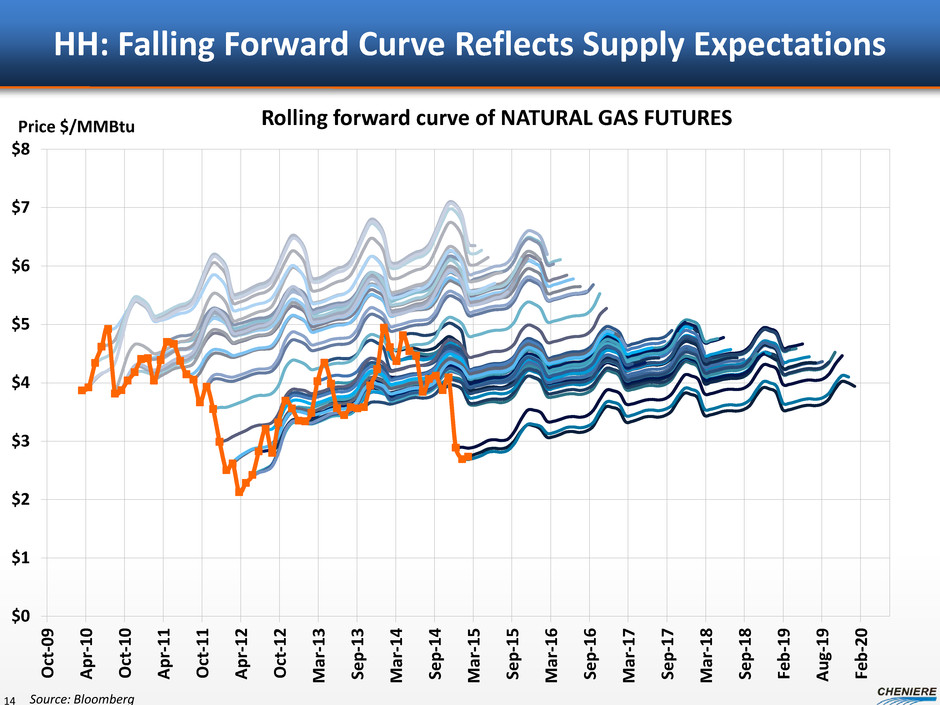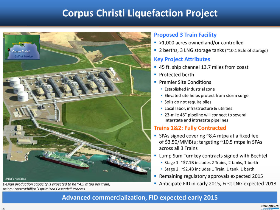 Cheniere Optimally Positioned to Address Constraints Across the Hydrocarbon Chain 13 Downstream logistics and market development Regasification Power Plants Liquids Logistics Upstream logistics and hydrocarbon capture Texas Supply Midstream Pipelines Storage Sabine Pass Liquefaction Corpus Christi Liquefaction Cheniere Liquids Terminal San Patricio Hub