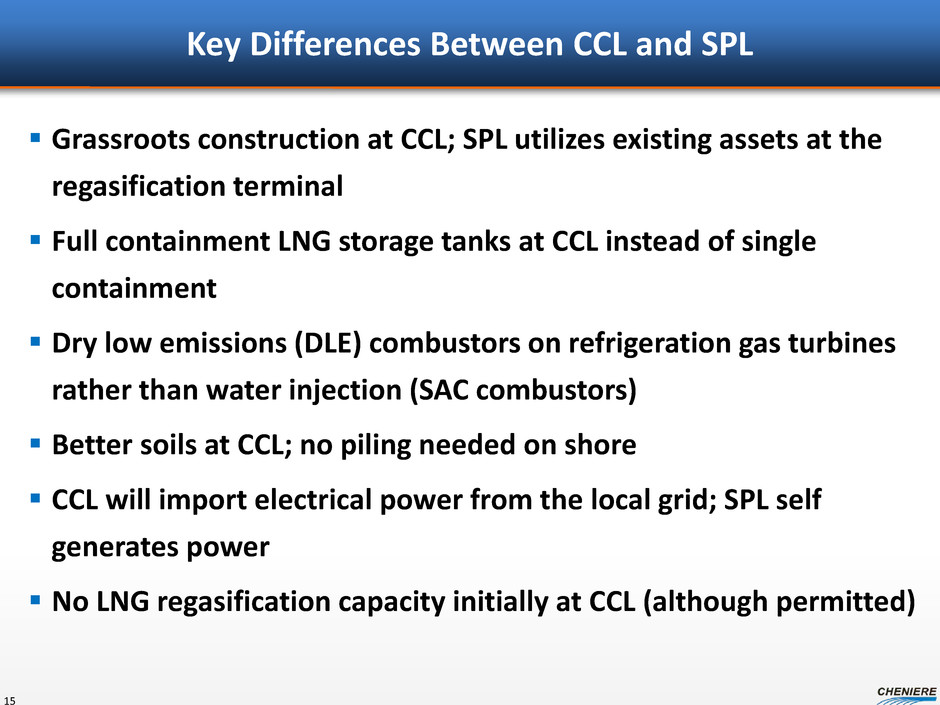 Sabine Pass Liquefaction Train 6 14 Sabine Pass Liquefaction Train 6 Estimates Design production capacity is expected to be ~4.5 MTPA, using ConocoPhillips’ Optimized Cascade® Process. SPL Train 6 Target FID date H2 2015 Capex estimate(1) ~$3 billion Project equity (operating cash flow or public capital market financings) ~$1.5 billion Project debt ~$1.5 billion Target COD 2020 Target commercial assumptions 20-year “take-or-pay” style SPAs 1.5 MTPA(2) at $3.50 per MMBtu CMI portfolio volumes 3.0 MTPA(2) at projected gross margin of $4.00- $7.00/MMBtu Note: Final investment decision dependent on completion of various regulatory, financing and commercial milestones. (1) Includes EPC and owner’s costs, interest during construction and other financing costs. (2) Assumes 1.5 MTPA sold under 20-year “take-or-pay” style SPAs. Assumes CMI sales of 3.0 MTPA of capacity (100% of remaining 3.0 MTPA). Equity SPL Train 6 LNG customers Project Lenders ~$1.5 billion ~$1.5 billion • Operating cash flow and/or public capital market financings 20-year SPA capacity sales • ~$0.3 billion in annual revenues CMI sales • ~$0.6 to ~$1.1bn in annual revenues(2) Artist’s rendition Existing Operational Facility Under Construction Trains 1 – 4 Train 6 Train 5